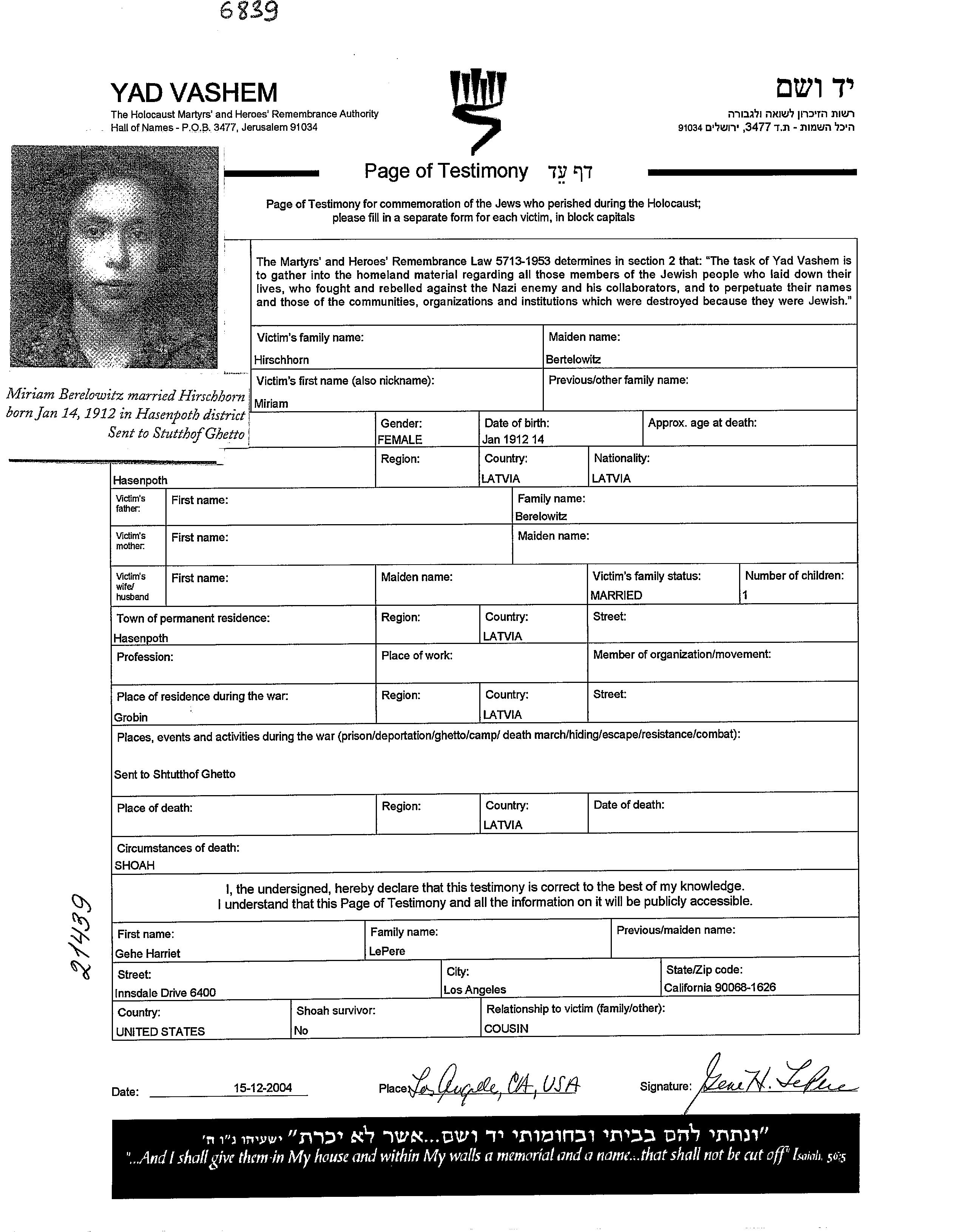 Hirschhorn Miriam 1912 Hasenpoth, Lettonie Feuille de témoignage (digitale-signée)