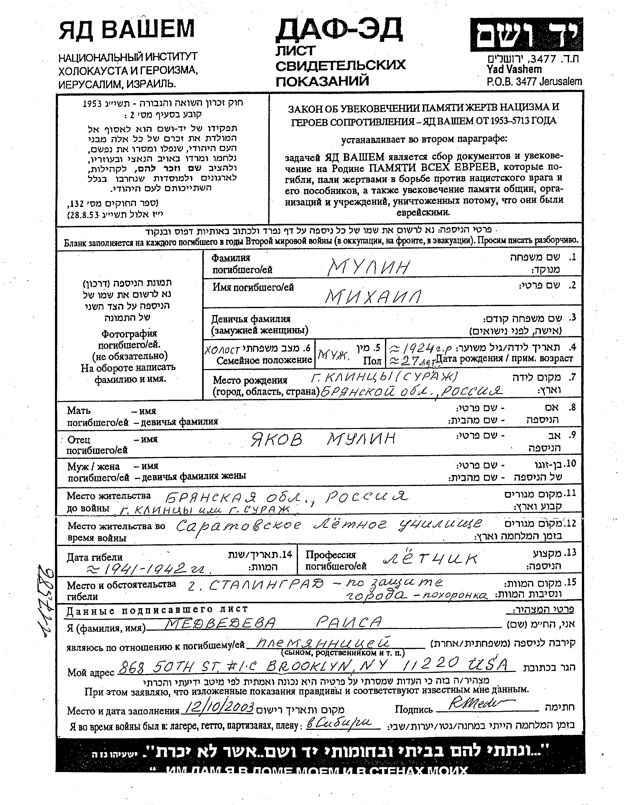 Mulin Mikhail 1924 Klintsy, Russie (URSS) Feuille de témoignage