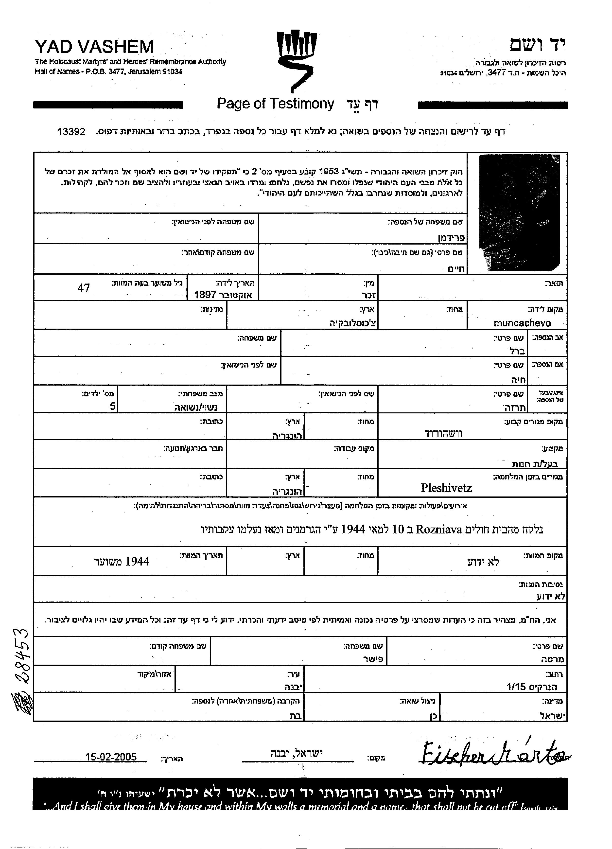 Fridman Khaim 1897 Uzhorod, Tchécoslovaquie Feuille de témoignage (digitale-signée)