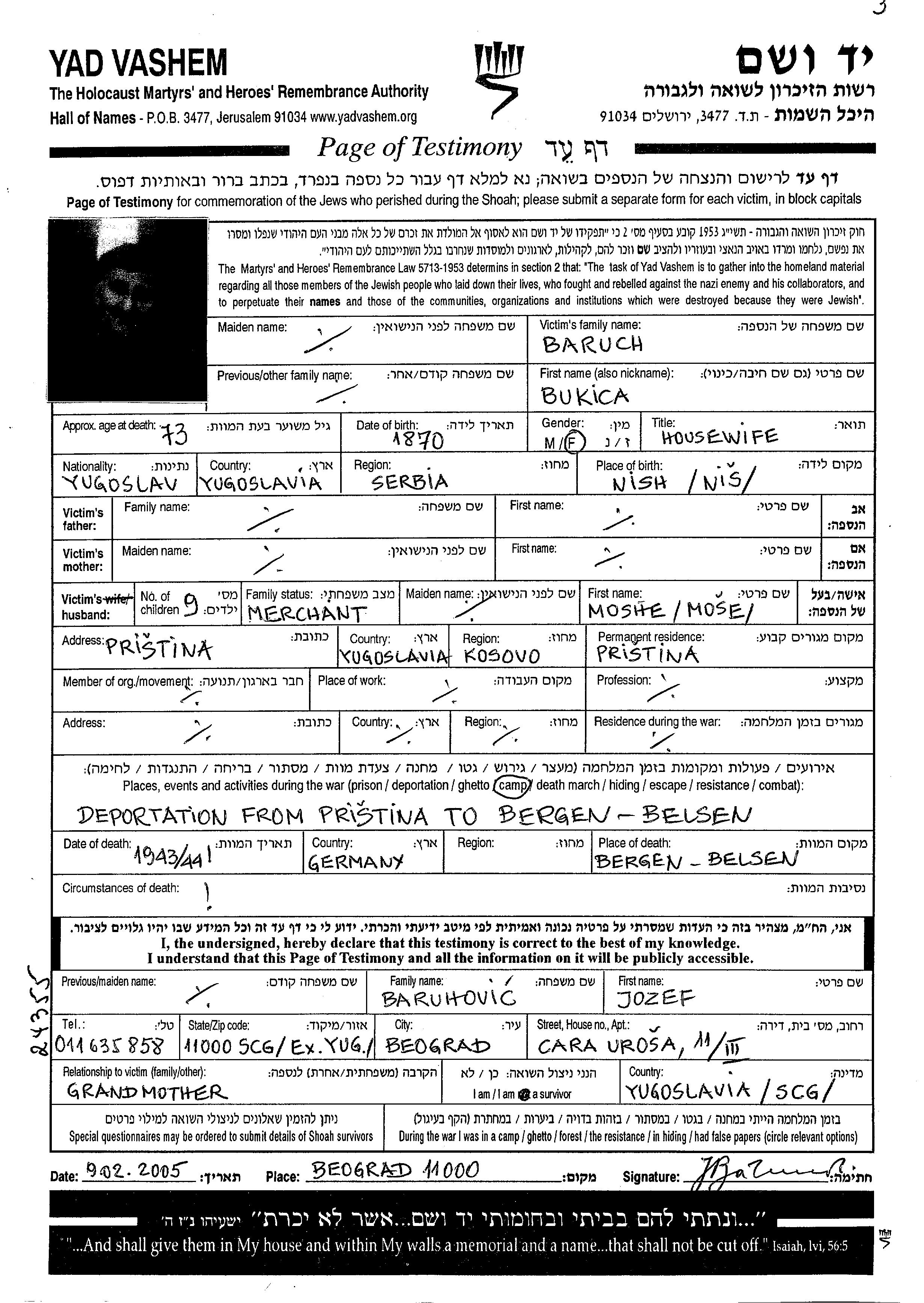 Baruch Bukica 1870 Pristina, Yugoslavie Feuille de témoignage