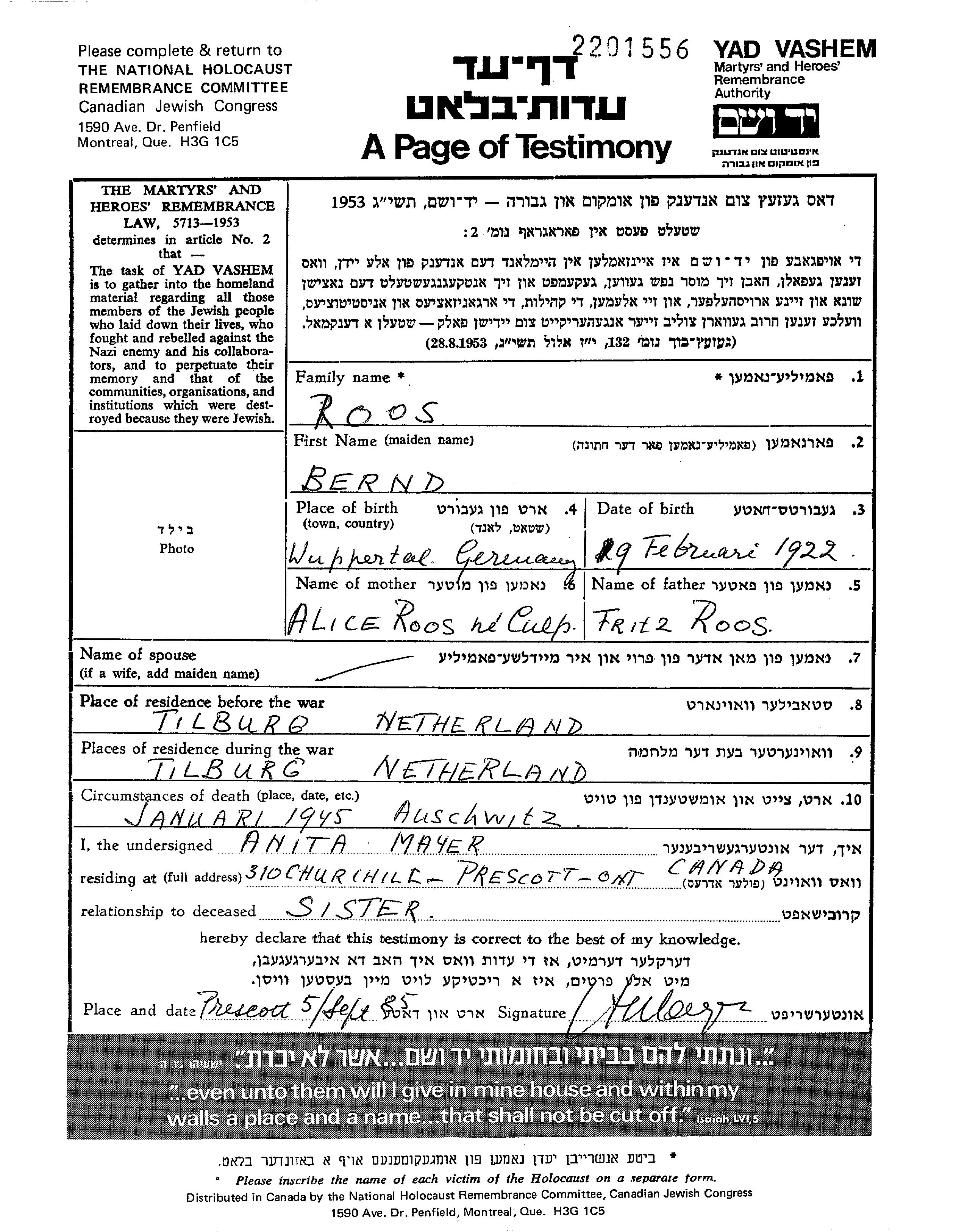 Ross Rus Bernd 1922 Tilburg, Pays-Bas Feuille de témoignage
