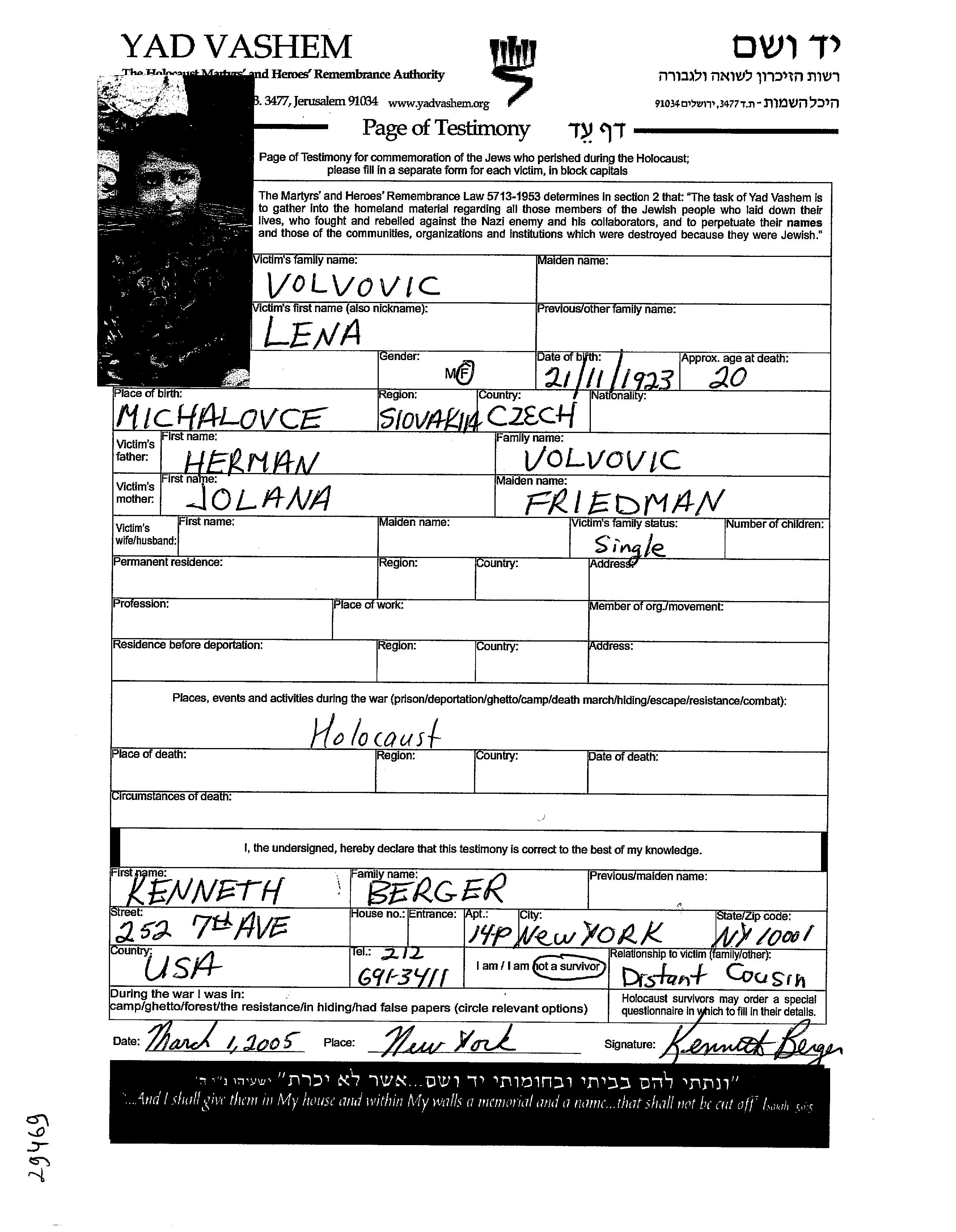 Volvovic Lena 1923 endroit inconnu, Feuille de témoignage