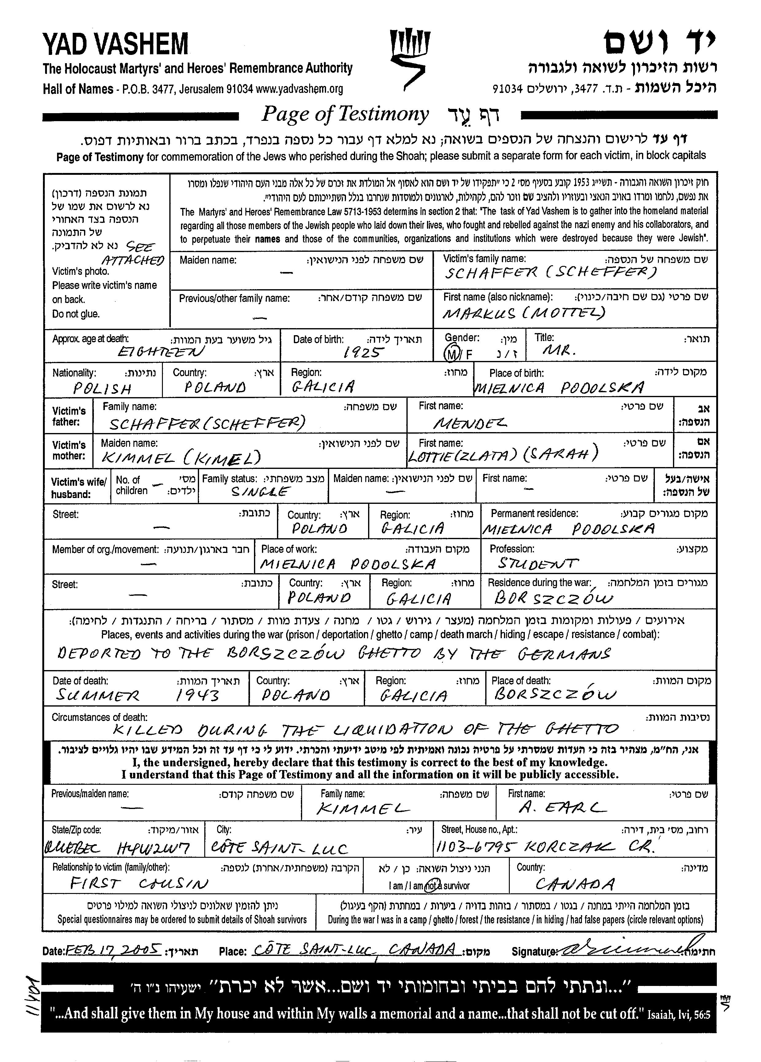Mottel Markus Scheffer est né à Mielnica, Pologne en 1925. Avant la seconde guerre mondiale il vivait à Mielnica, Pologne.