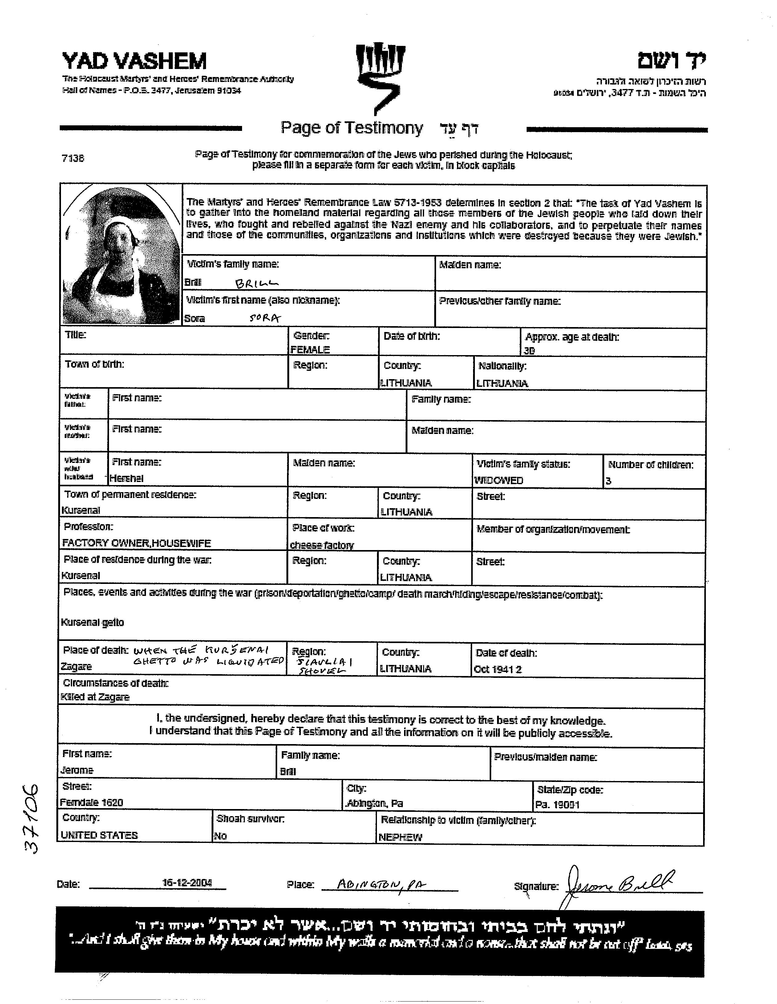 Sora a été assassinée pendant la Shoah. Lieu de la mort: Žagarė, Lituanie en 02/10/1941.