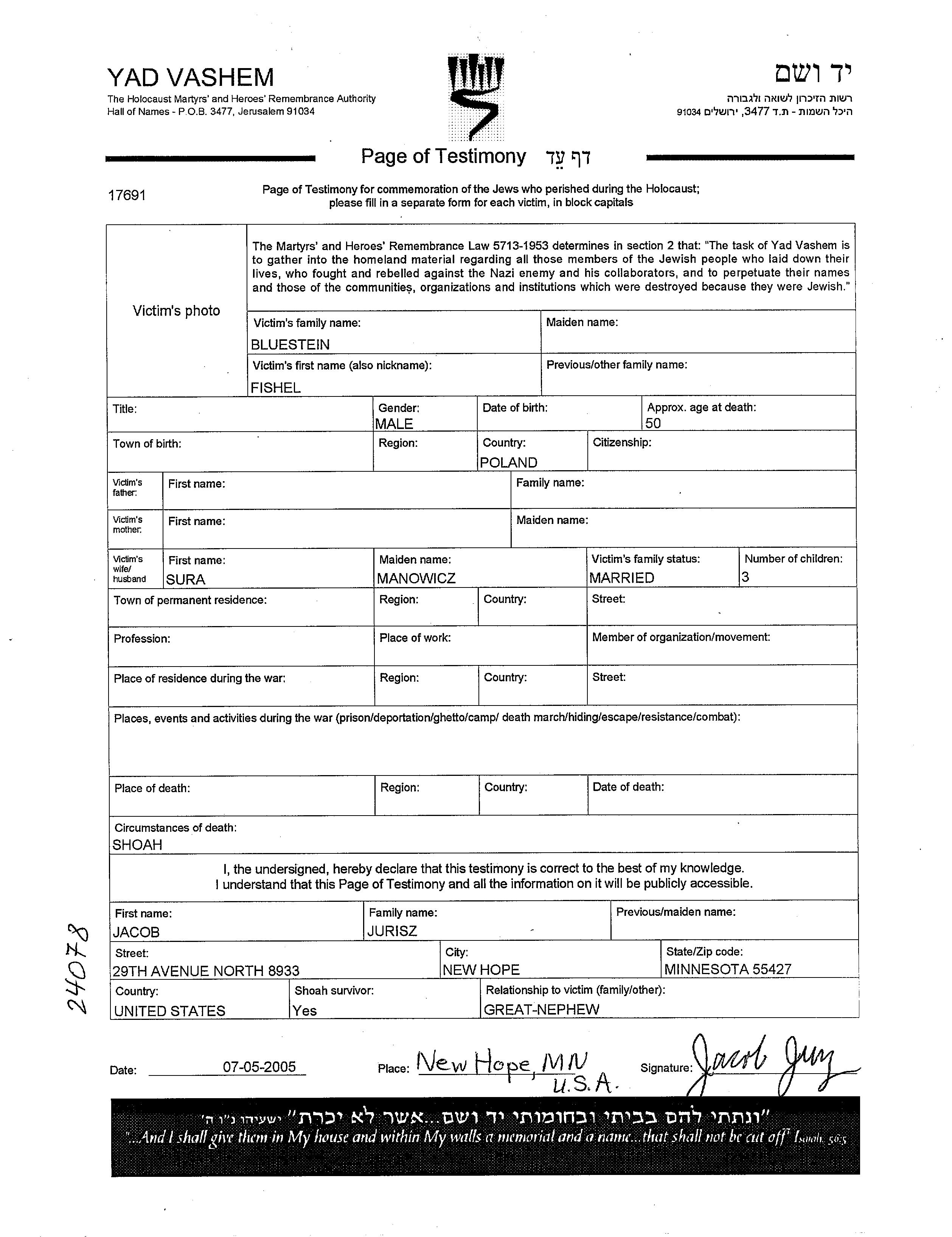 Bluestein Fishel endroit inconnu, Feuille de témoignage (digitale)