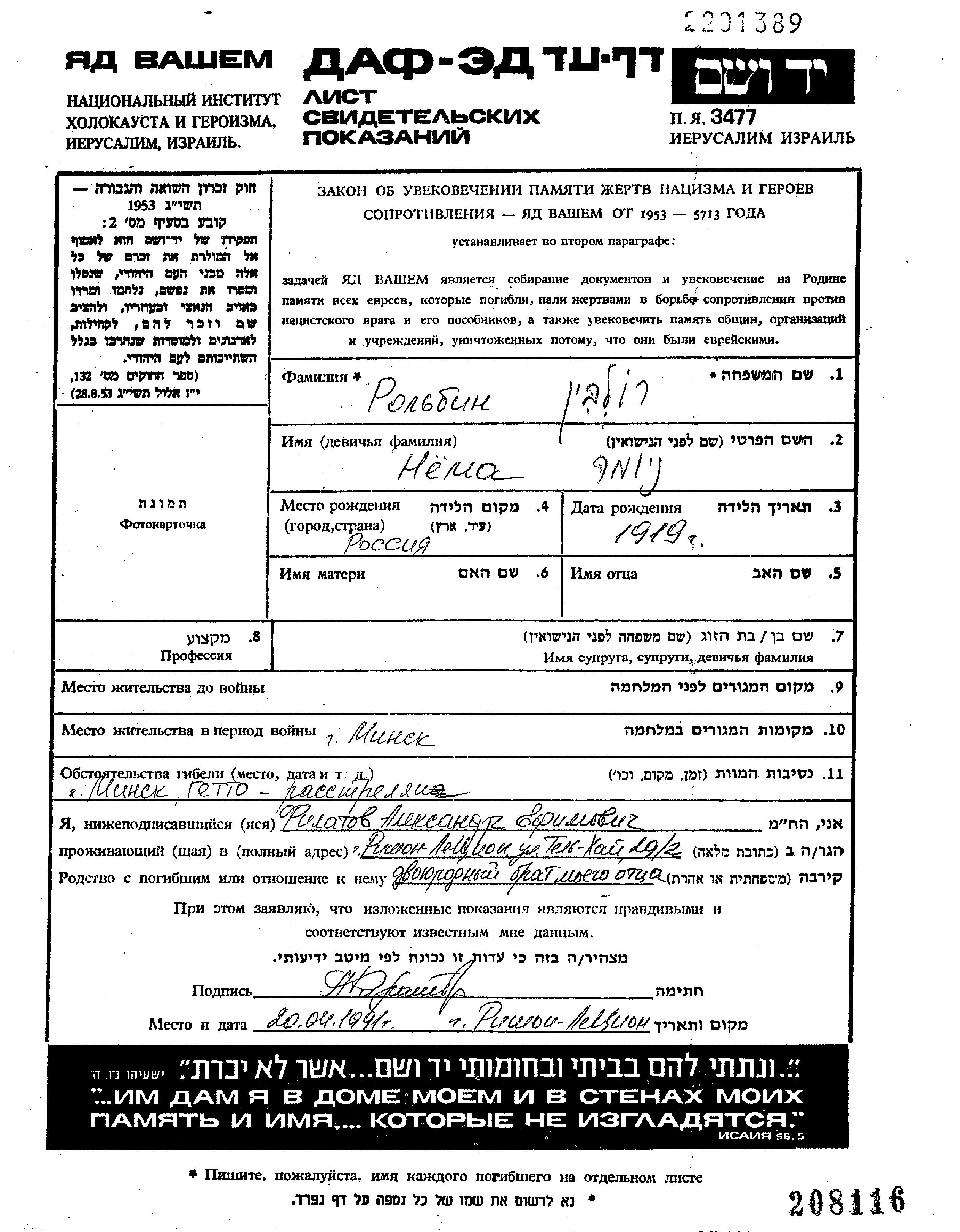 Nema Rolbin est né à Russie (URSS) en 1919. Il était Célibataire. Au cours de la guerre, il était à Minsk, Bélorussie (URSS).