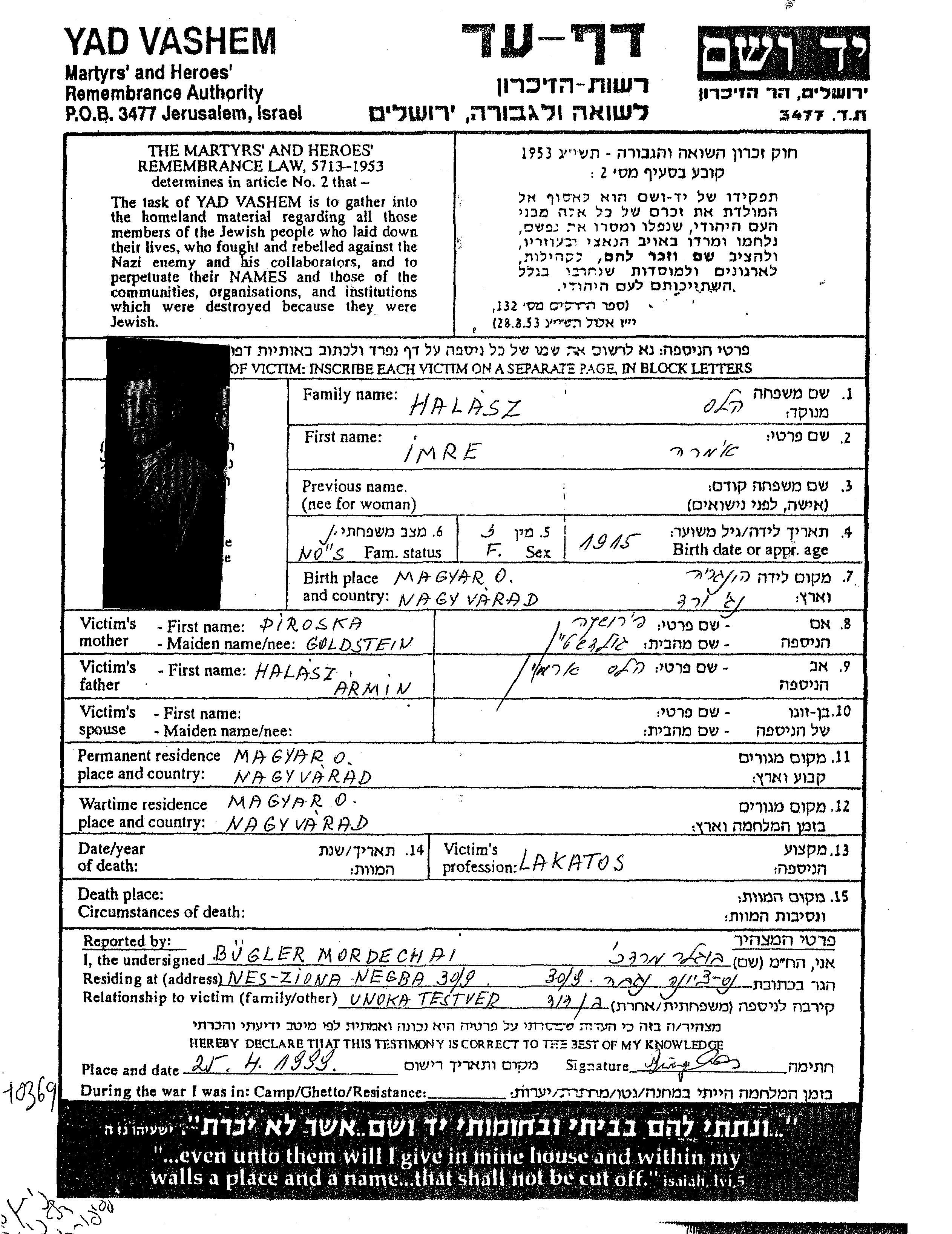 Halasz Imre 1915 Nagyvarad, Roumanie Feuille de témoignage