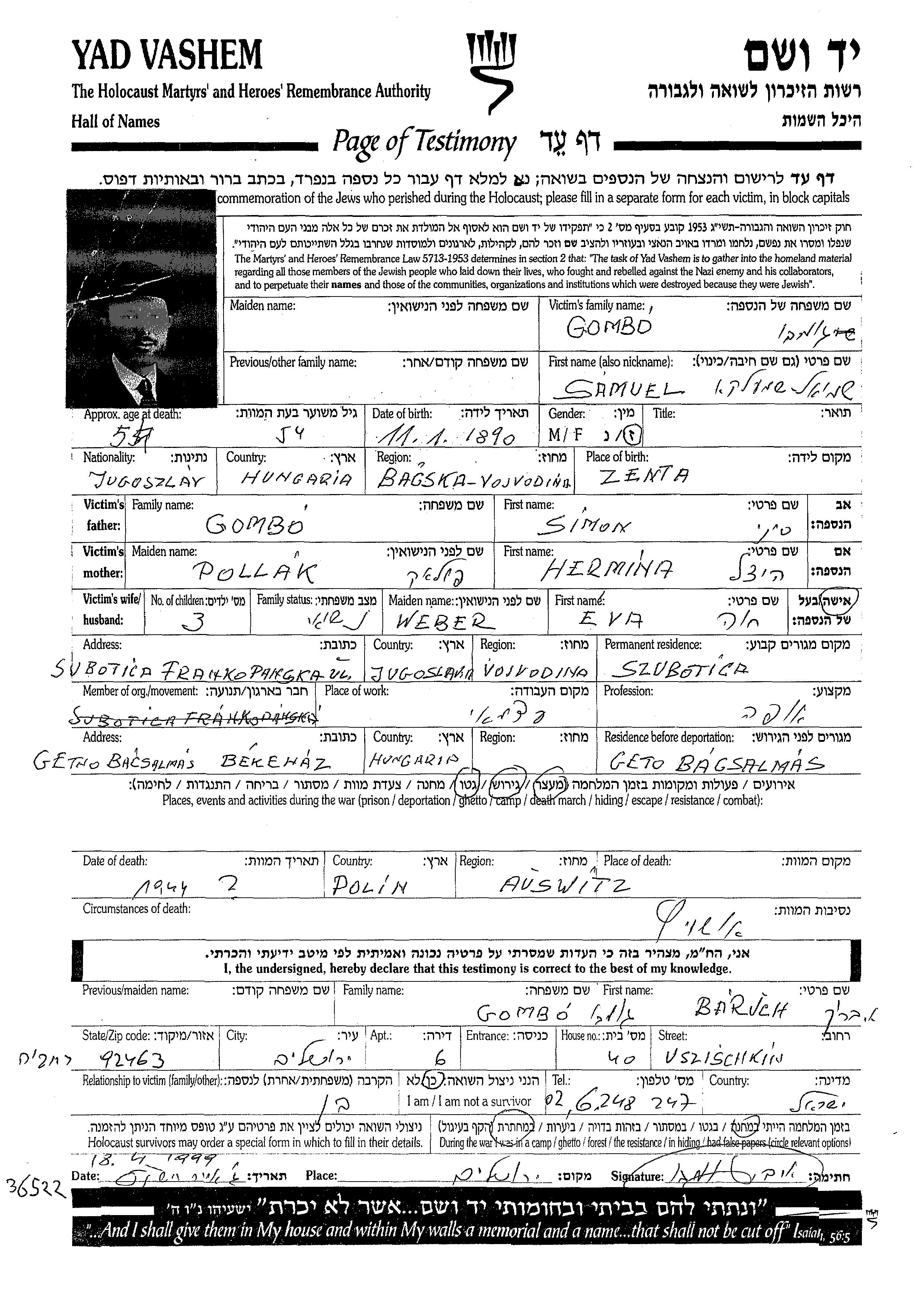 Samuel Gombo est né à Senta, Yugoslavie en 1890. Il était Boulanger/e. Avant la seconde guerre mondiale il vivait à Subotica, Yugoslavie.