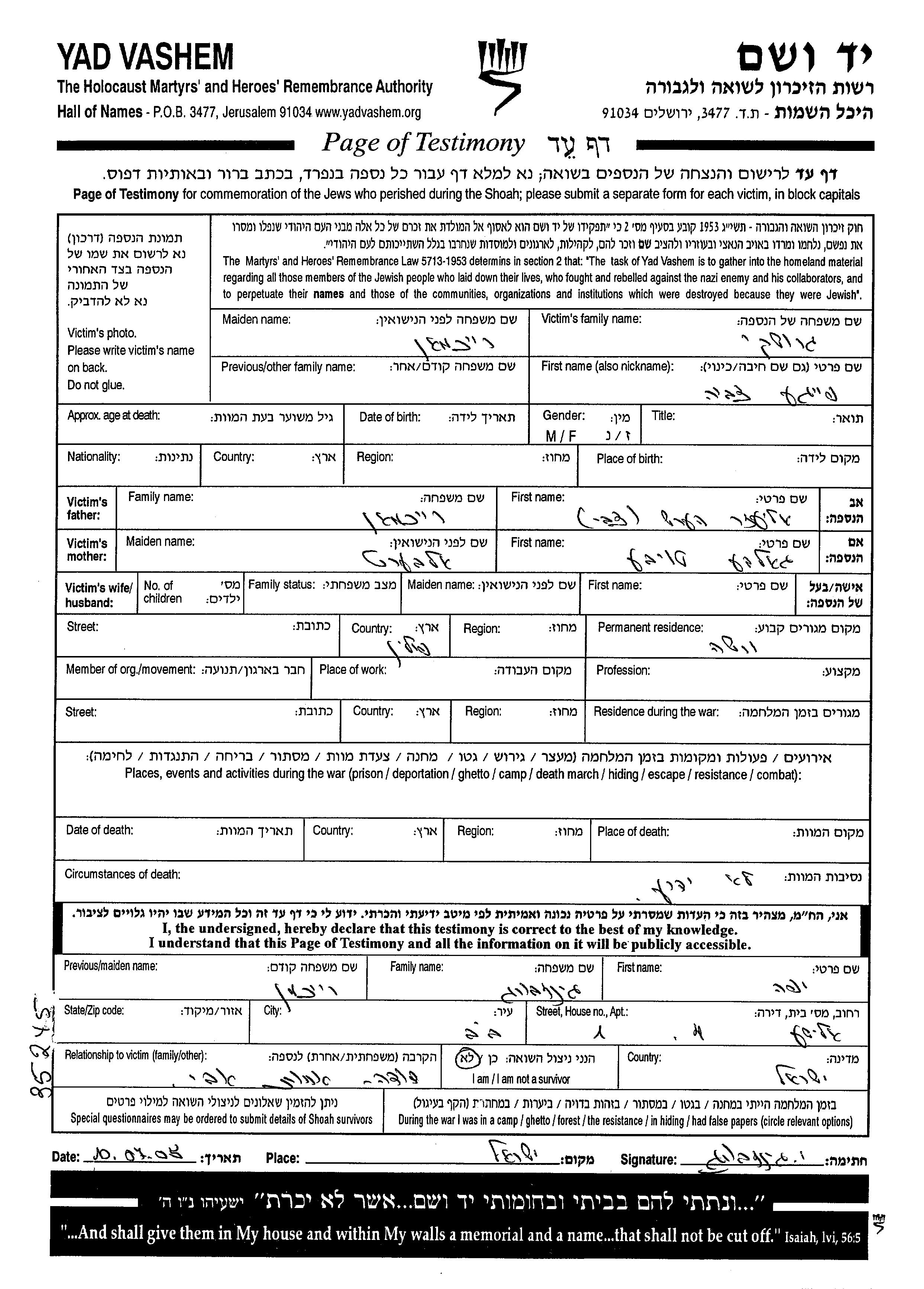 Yad Vashem - Pages of Testimony Names Memorial Collection