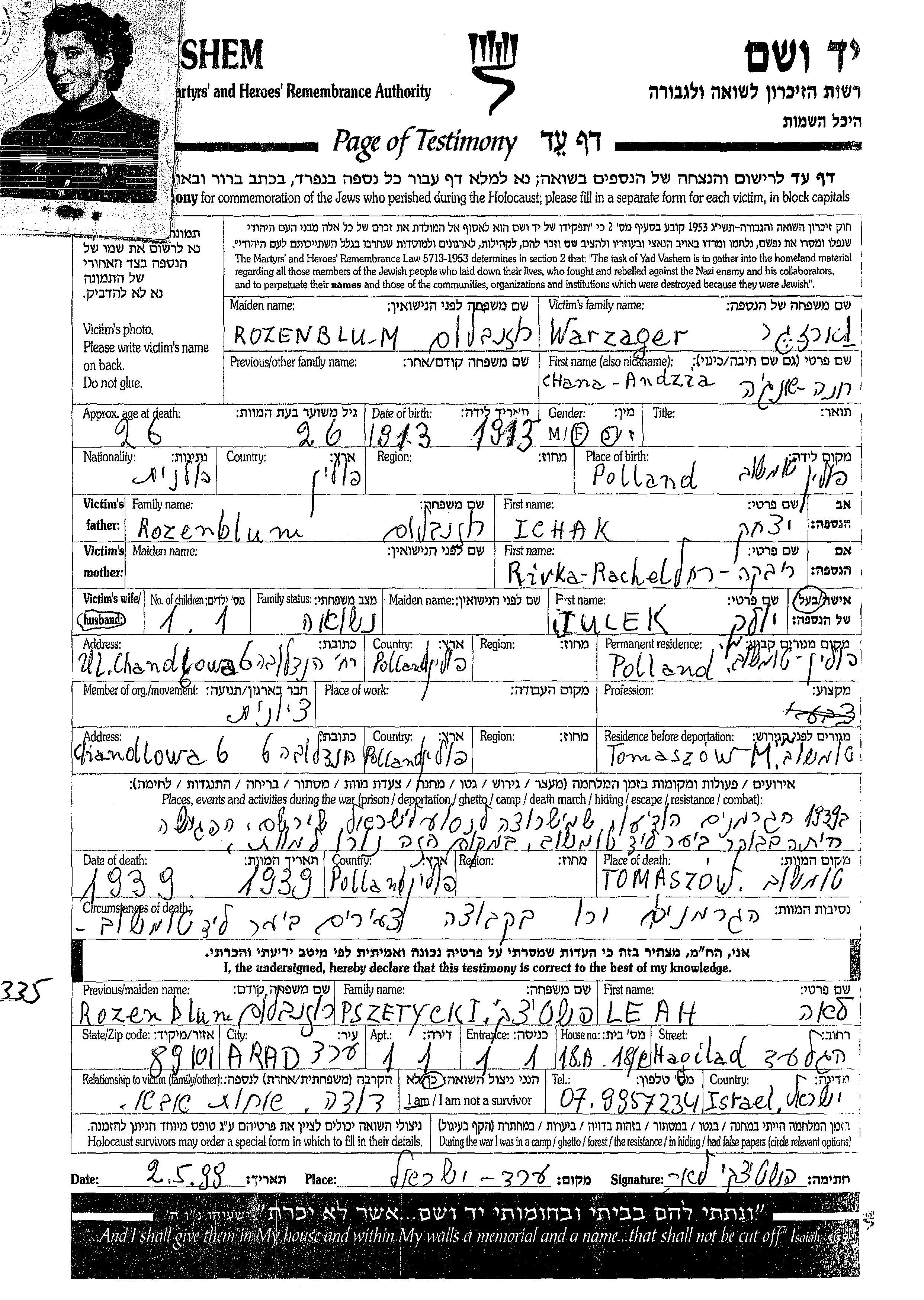 Andzia Khana Varzager née Rozenblum est née à Tomaszow Mazowiecki, Pologne en 1913. Avant la seconde guerre mondiale elle vivait à Tomaszow Mazowiecki, Pologne. Andzia Khana a été assassinée pendant la Shoah. Lieu de la mort: Tomaszow Mazowiecki, Pologne.