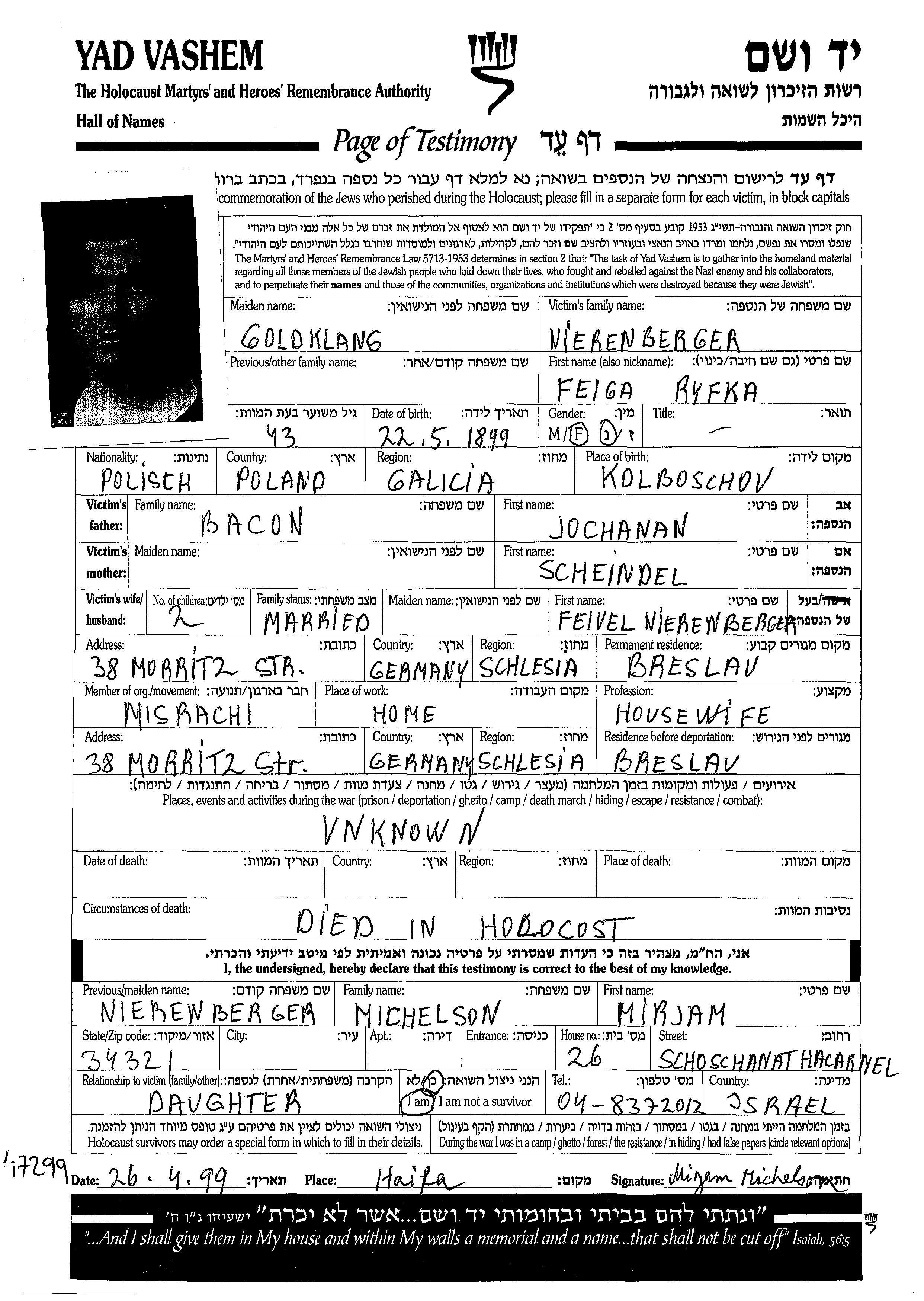 Ryfka Feiga Nierenberger née Goldklang est née à Kolbuszowa, Pologne en 1899. Elle était Femme au foyer. Avant la seconde guerre mondiale elle vivait à Breslau, Allemagne. Ryfka Feiga a été assassinée pendant la Shoah. Lieu de la mort: endroit inconnu.