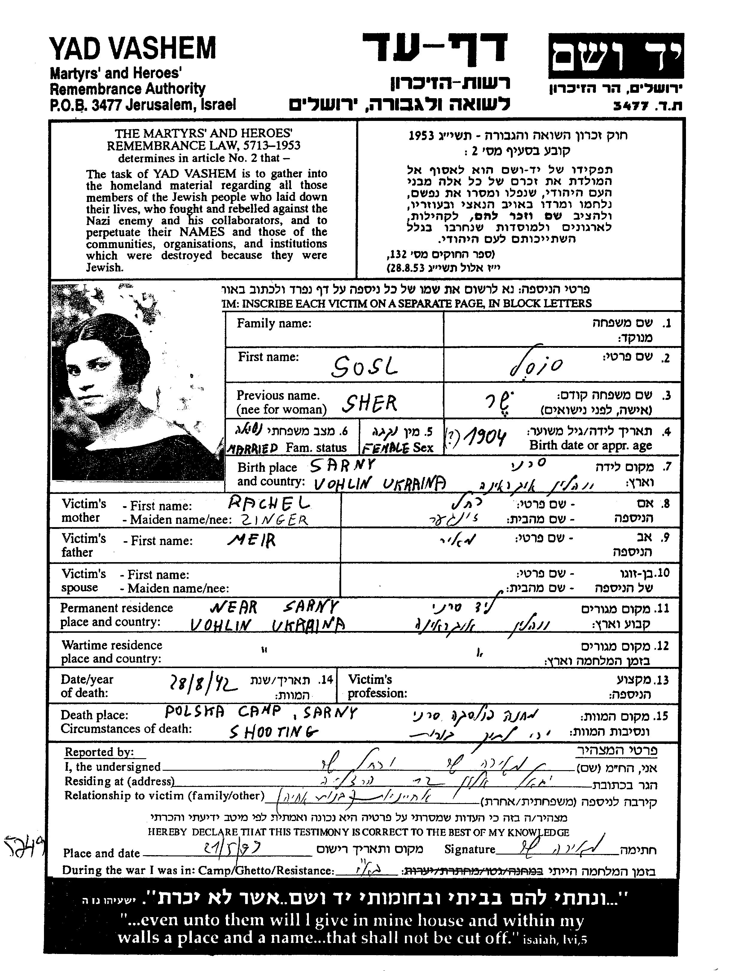 Sossel nom inconnu née Sher est née à Sarny, Pologne en 1904. Avant la seconde guerre mondiale elle vivait à Sarny, Pologne.