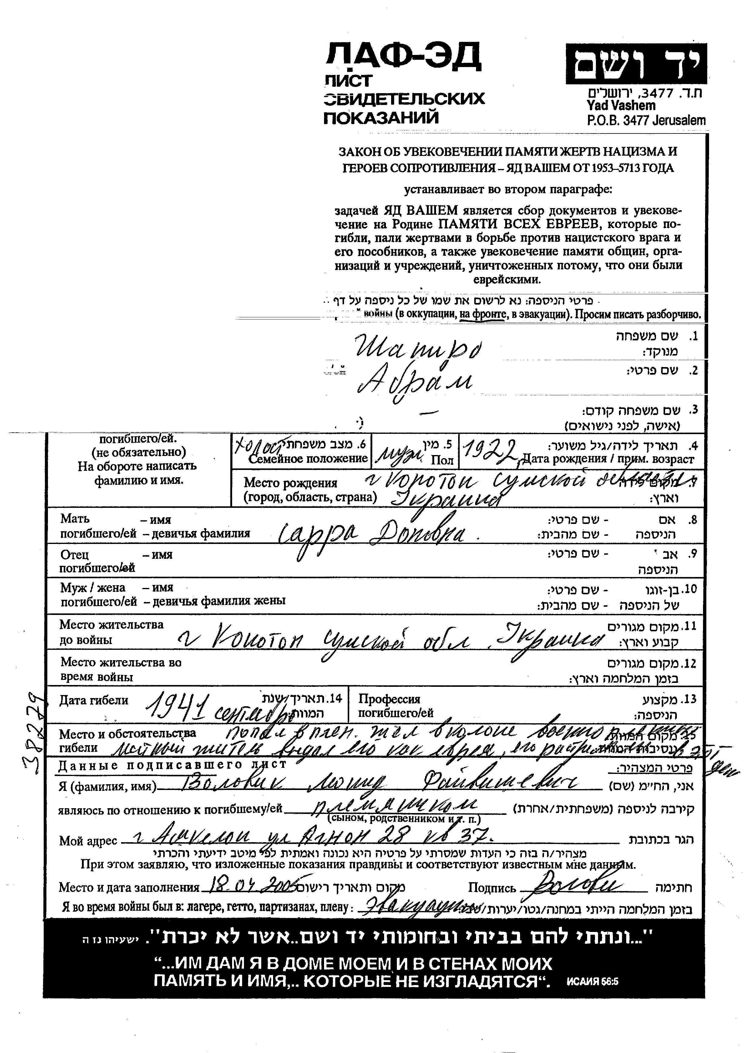 Shapiro Abram 1922 Konotop, Ukraine (URSS) Feuille de témoignage