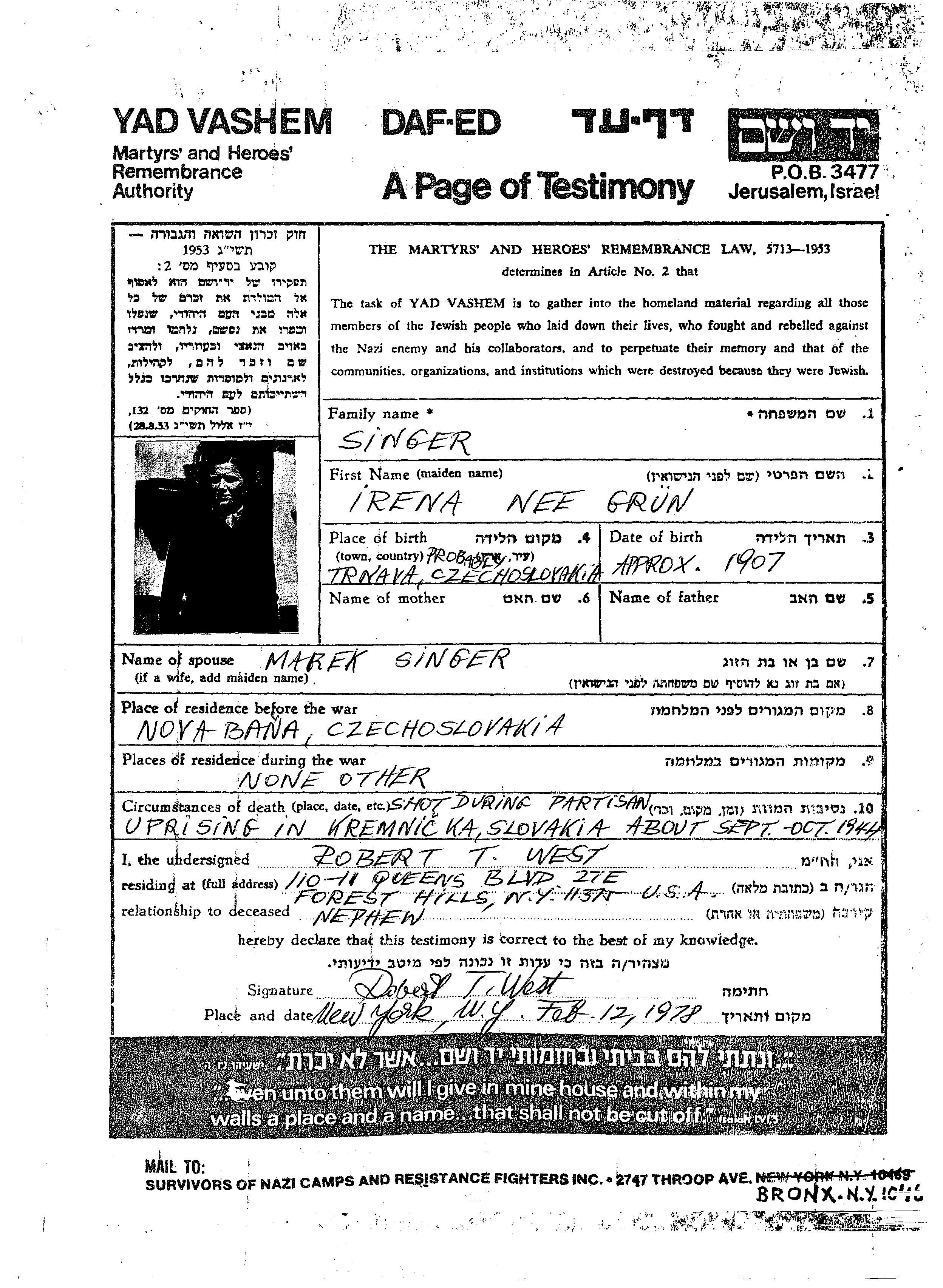 Irena Singer née Gruen est née à Trnava, Tchécoslovaquie en 1907. Avant la seconde guerre mondiale elle vivait à Nova Bana, Tchécoslovaquie.