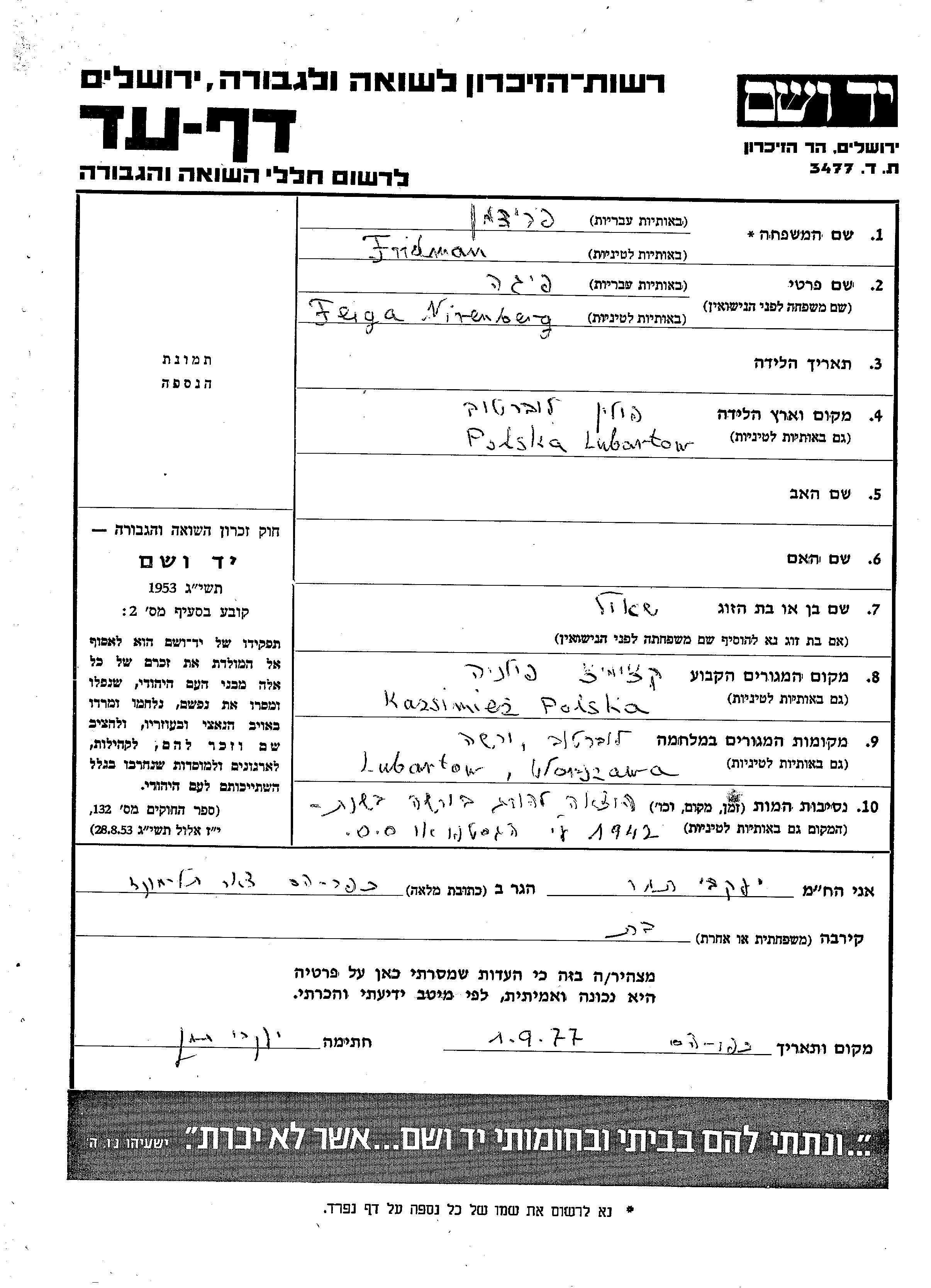 Feiga Fridman née Nirenberg est née à Lubartow, Pologne. Avant la seconde guerre mondiale elle vivait à Kazimierz Dolny, Pologne.
