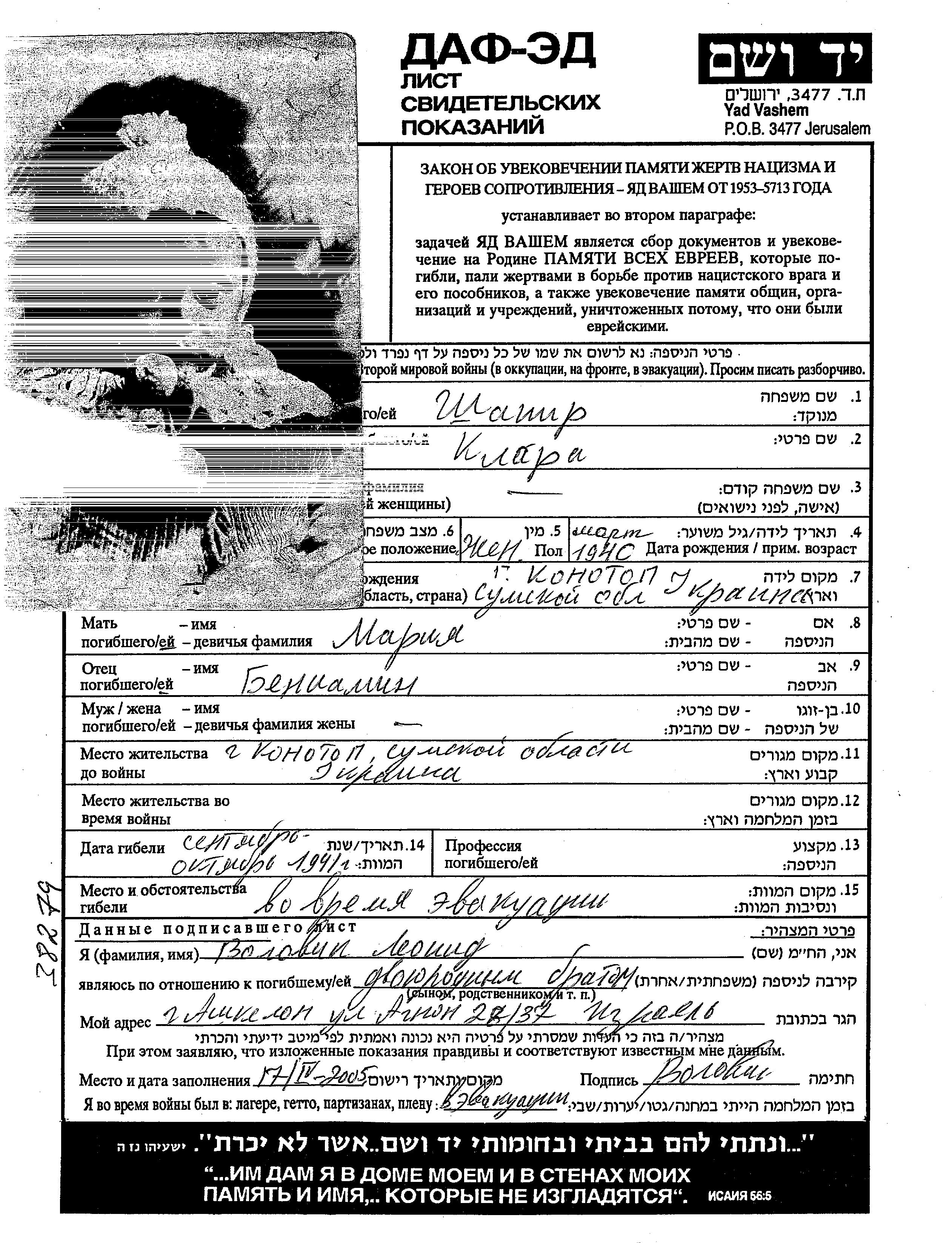 Shapir Klara 1940 Konotop, Ukraine (URSS) Feuille de témoignage