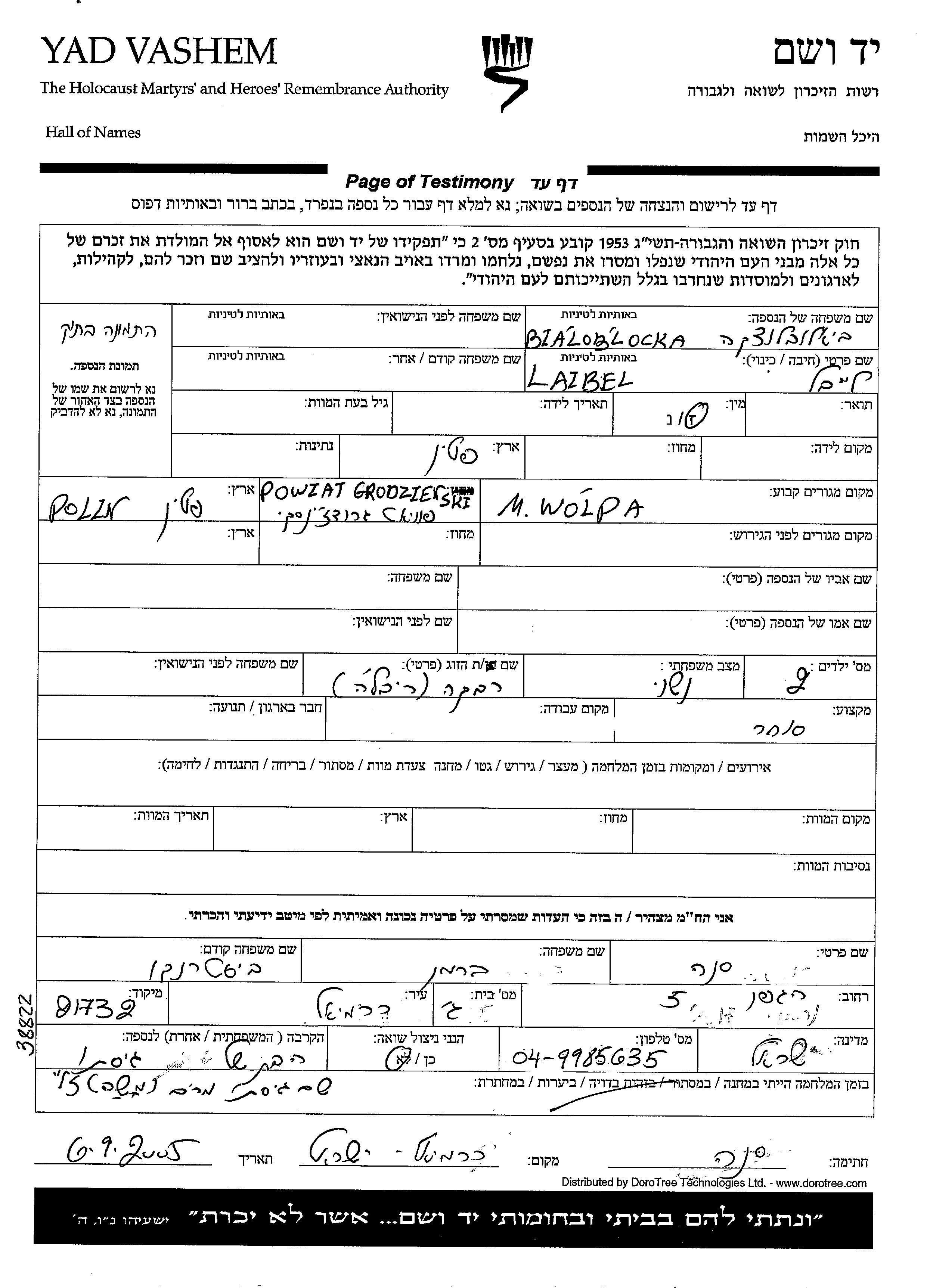 Bialoblocka Laibel Wolpa, Pologne Feuille de témoignage