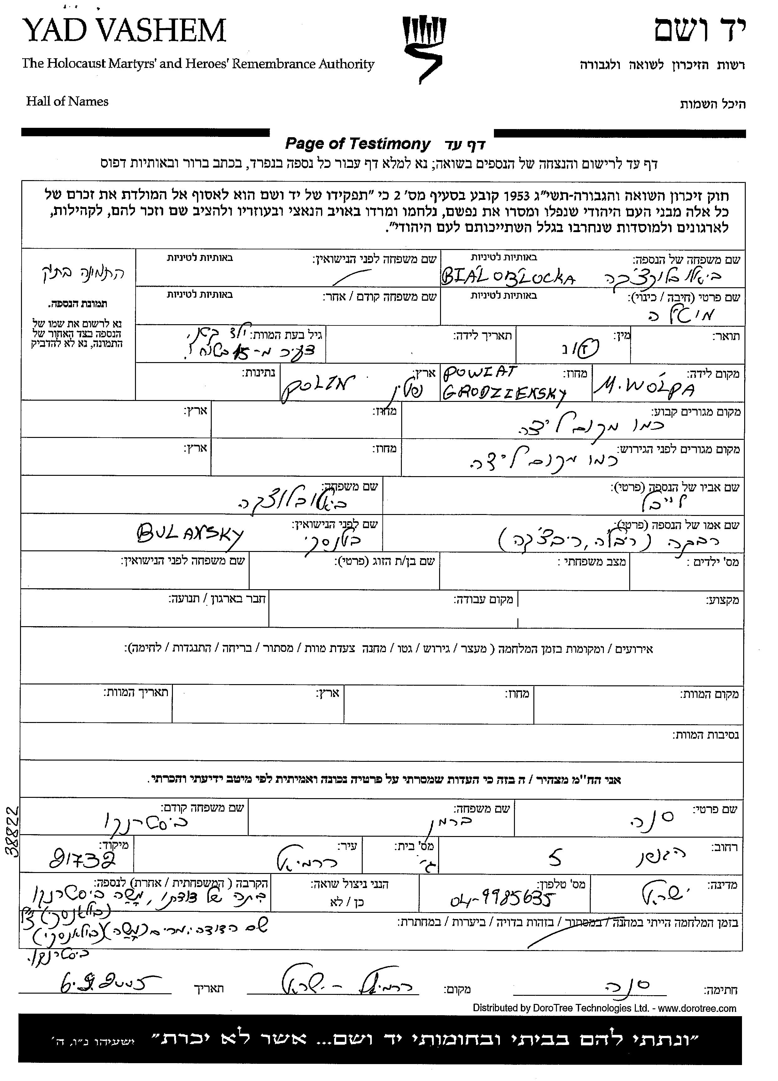 Bialoblocka Motila Wolpa, Pologne Feuille de témoignage