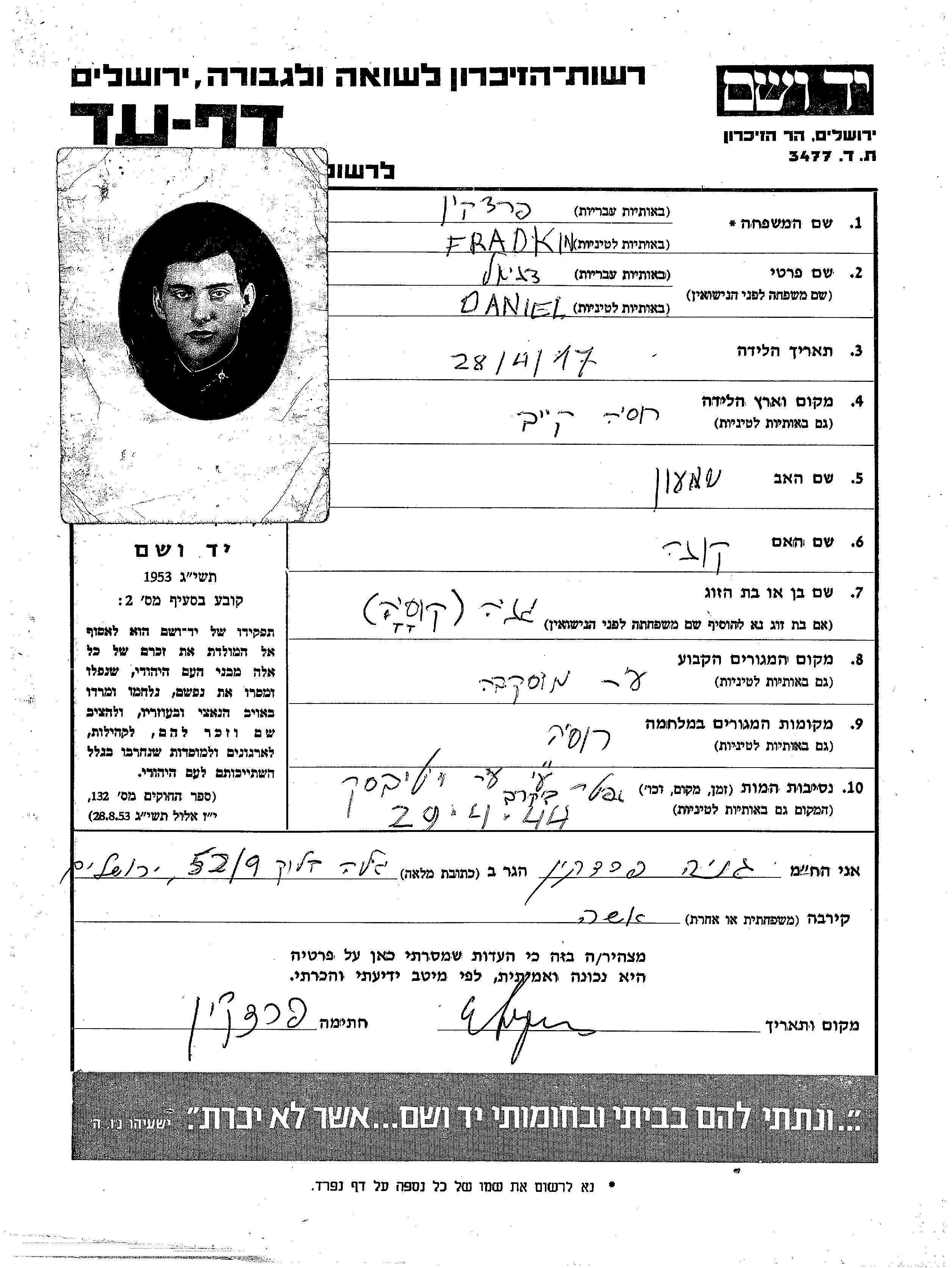 Daniel a été assassiné pendant la Shoah. Lieu de la mort: Vitebsk, Bélorussie (URSS) en 29/04/1944.