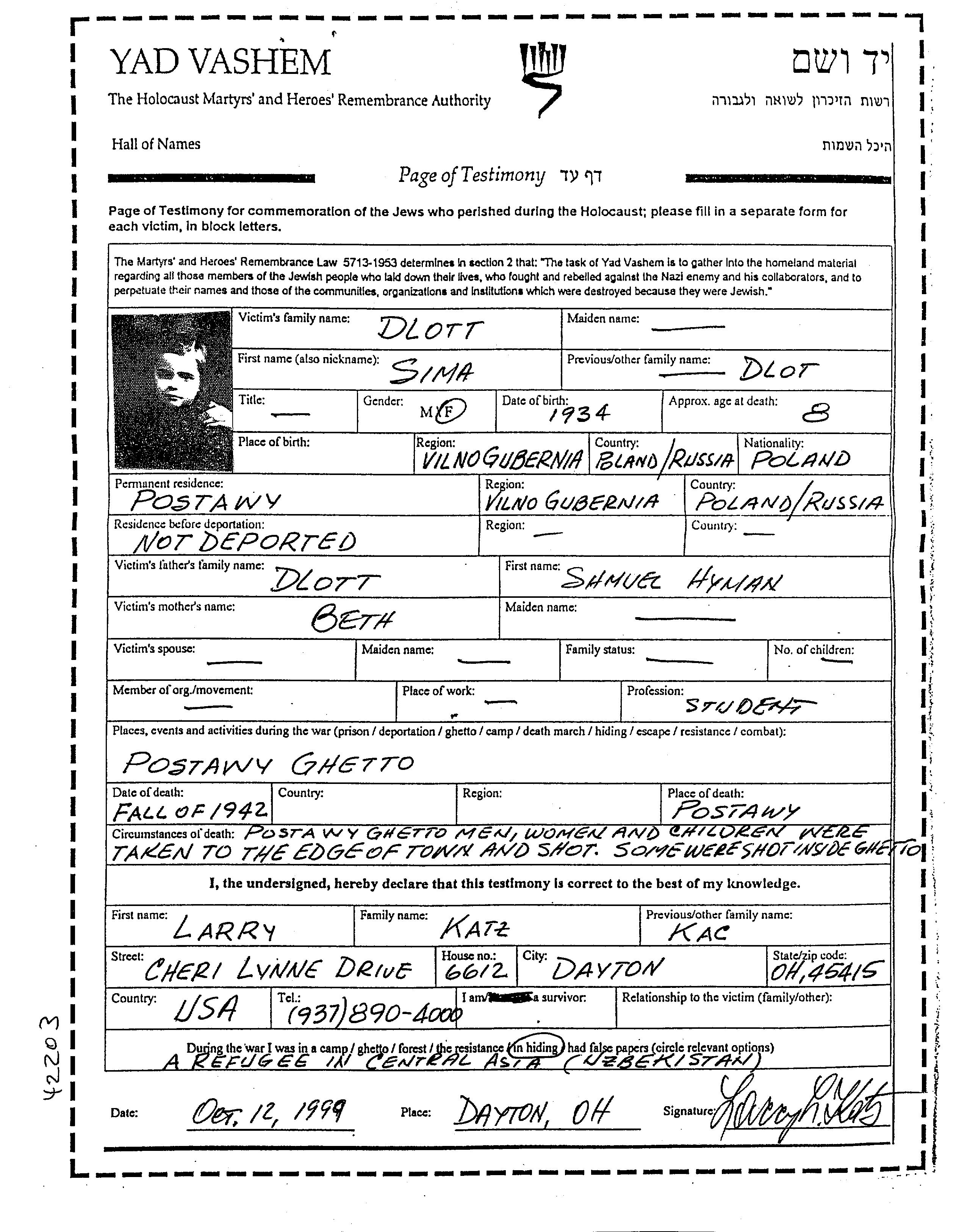 Dlott Sima 1934 Postawy, Pologne Feuille de témoignage
