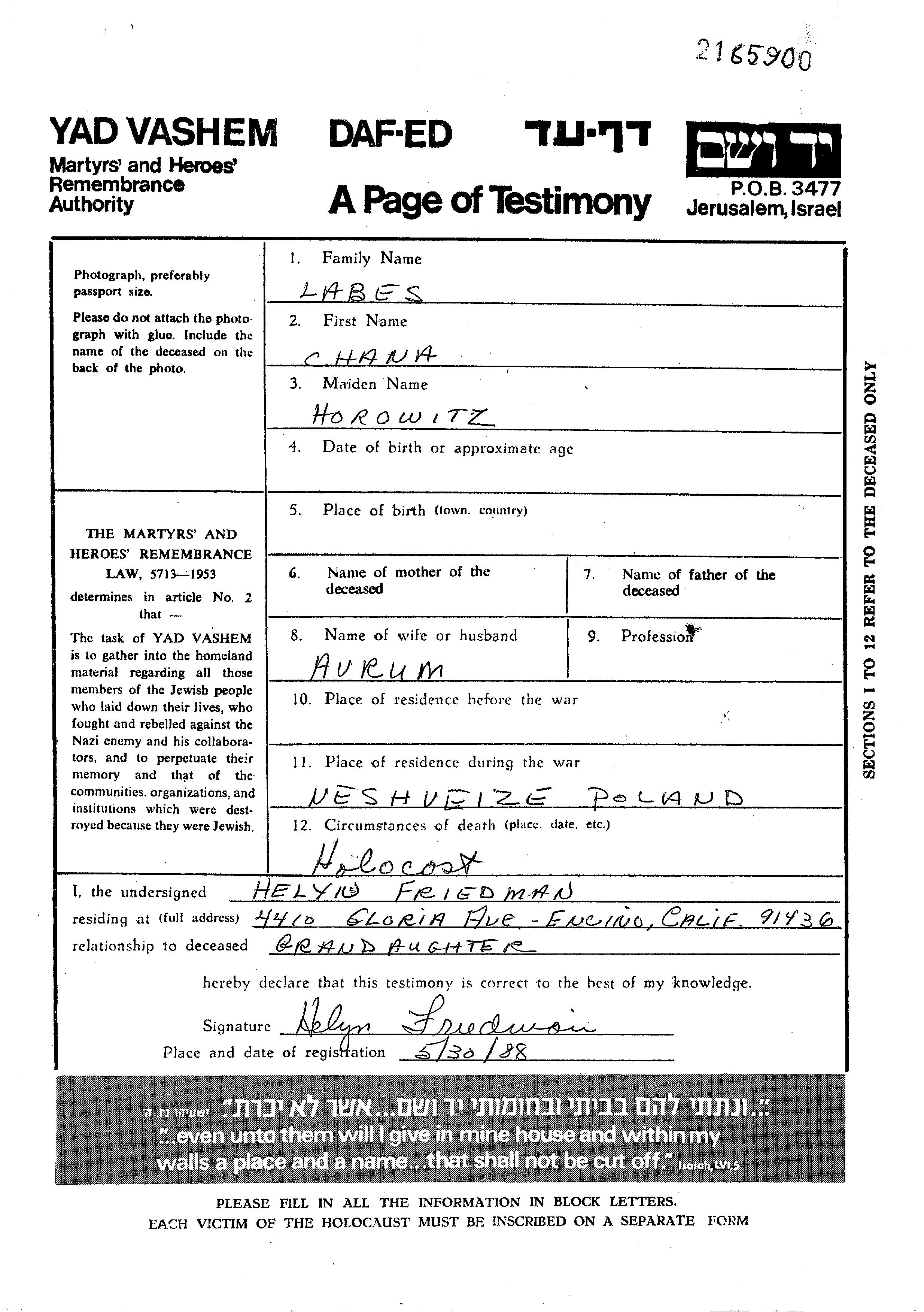 Chana Labes née Horowitz. Elle était Mariée à Avrum. Avant la seconde guerre mondiale elle vivait à Nieśwież, Pologne. Pendant la guerre, elle était à Nieśwież, Pologne.