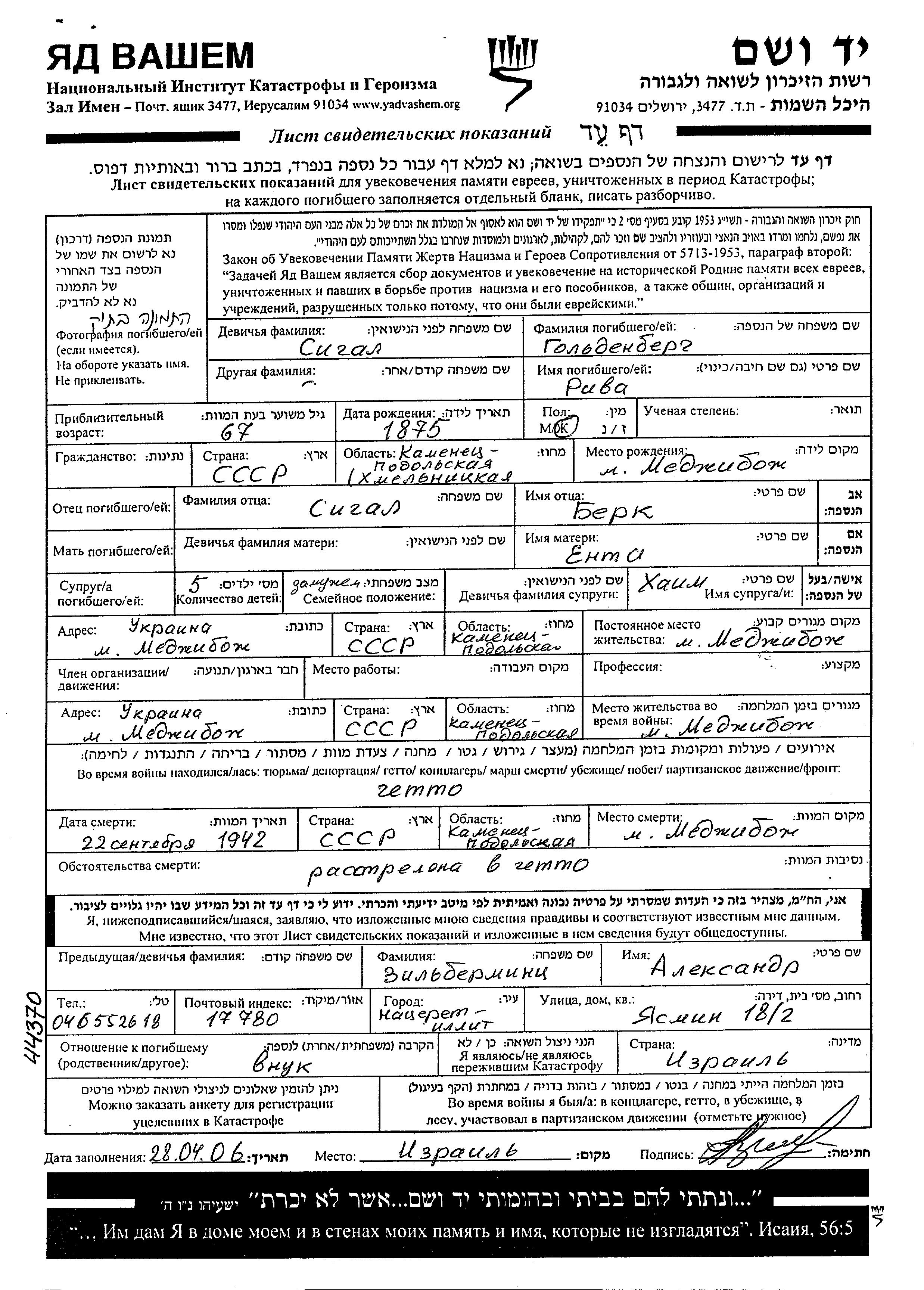 Goldenberg | Riva | 1875 | Medzhibozh, Ukraine (URSS) | Feuille de témoignage |