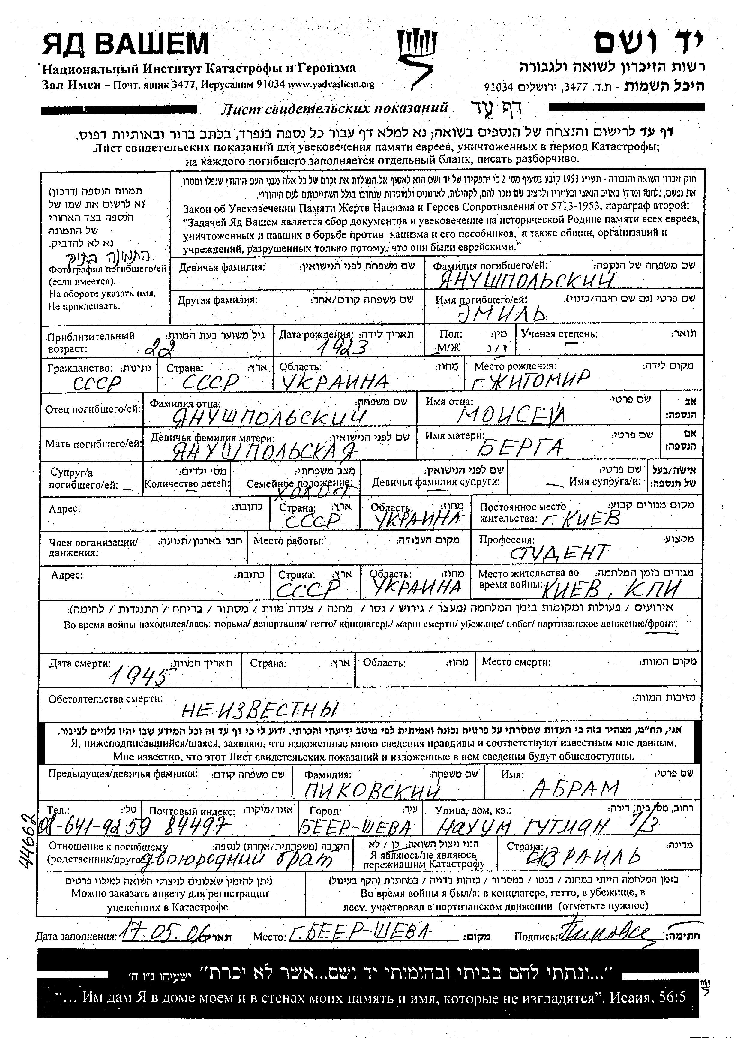 Yanushpolski Emil 1923 Kiev, Ukraine (URSS) Feuille de témoignage