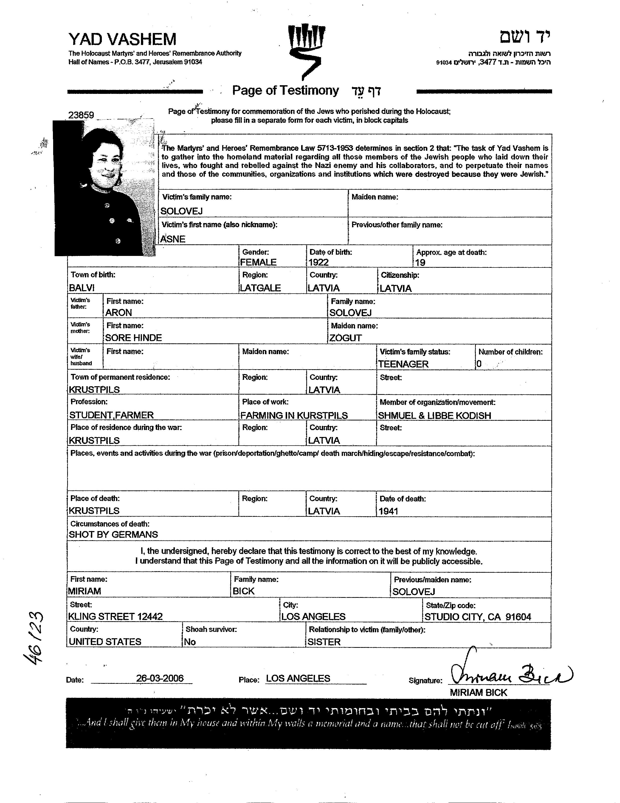 Yad Vashem - Pages of Testimony Names Memorial Collection