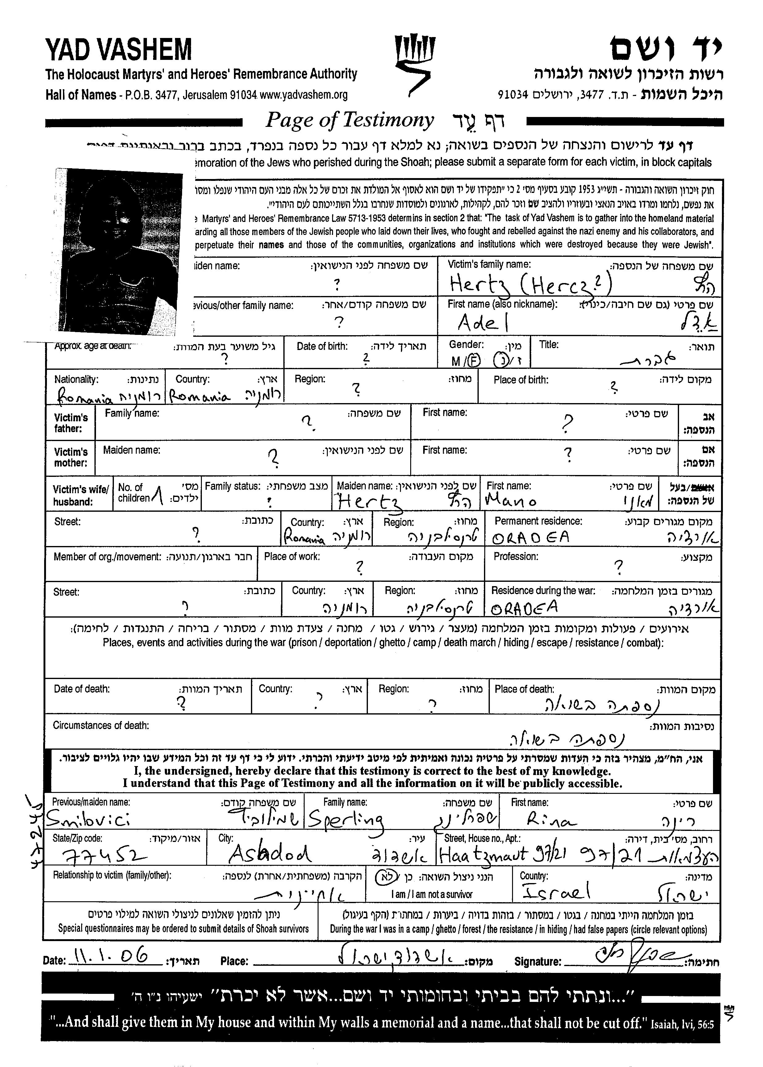 Adel Hertz née Edel est née à Roumanie. Avant la seconde guerre mondiale elle vivait à Oradea, Roumanie.