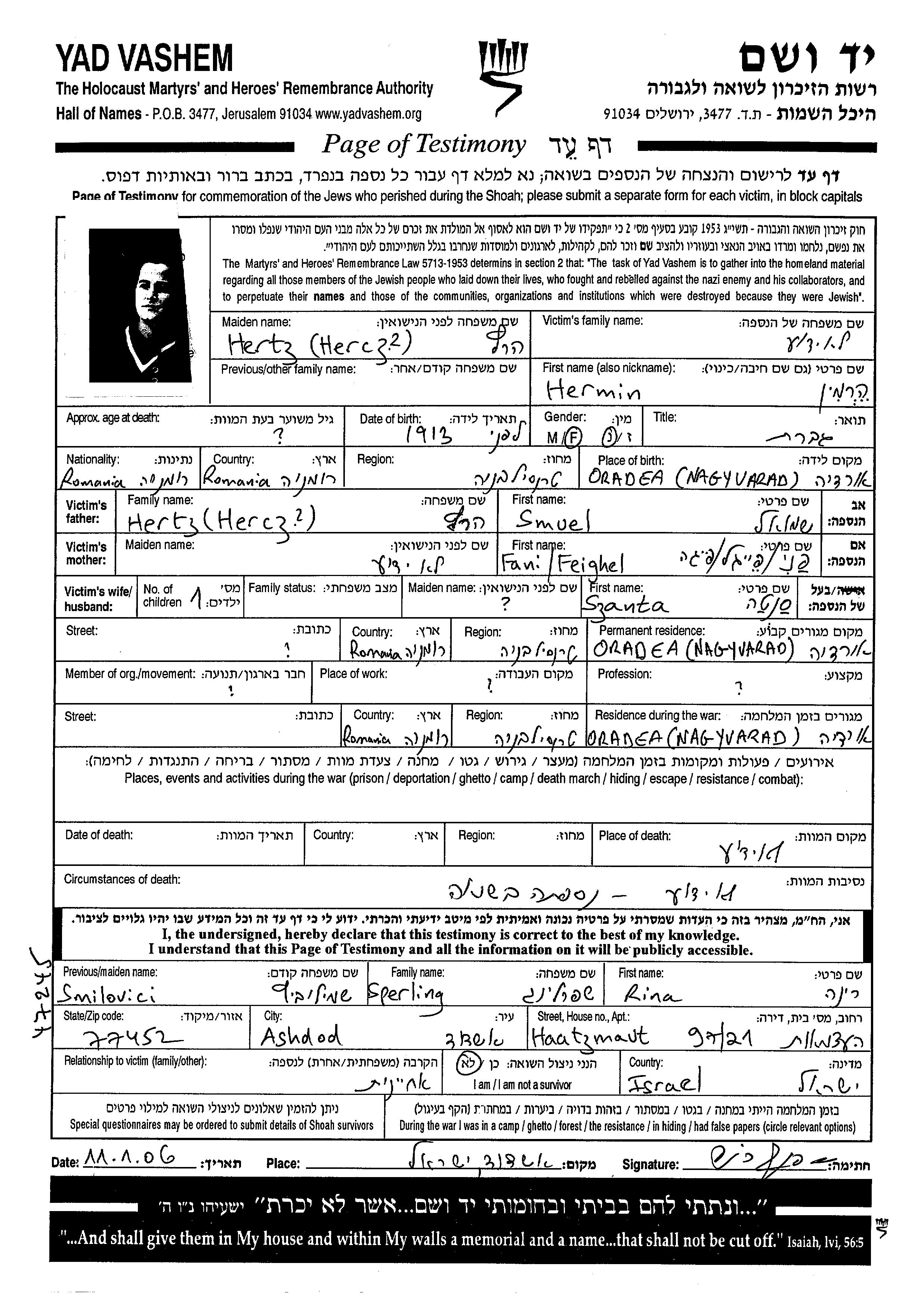 nom inconnu | Hermina | 1913 | Oradea, Roumanie | Feuille de témoignage |