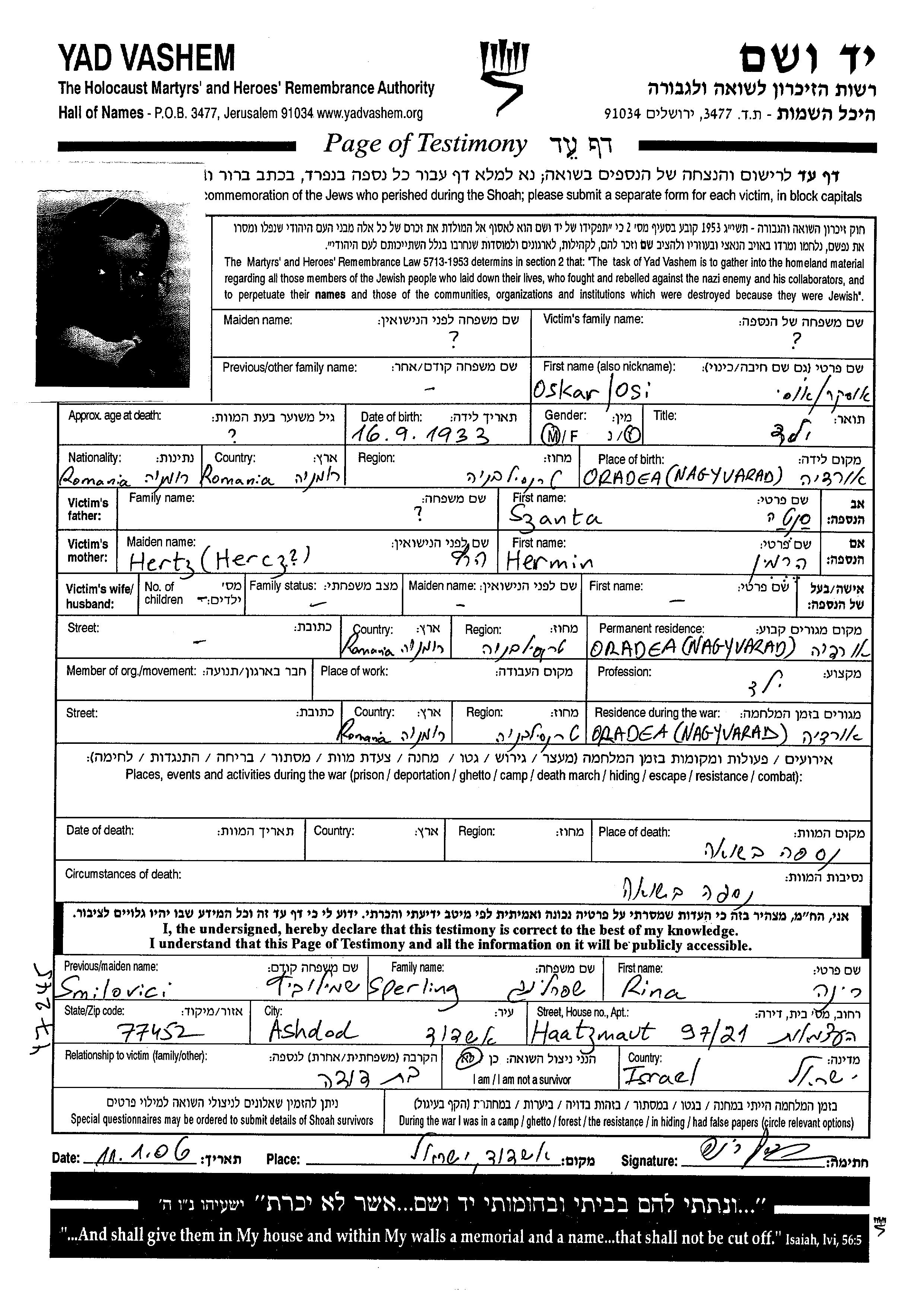 nom inconnu Oskar Osi 1933 Nagyvarad, Roumanie Feuille de témoignage