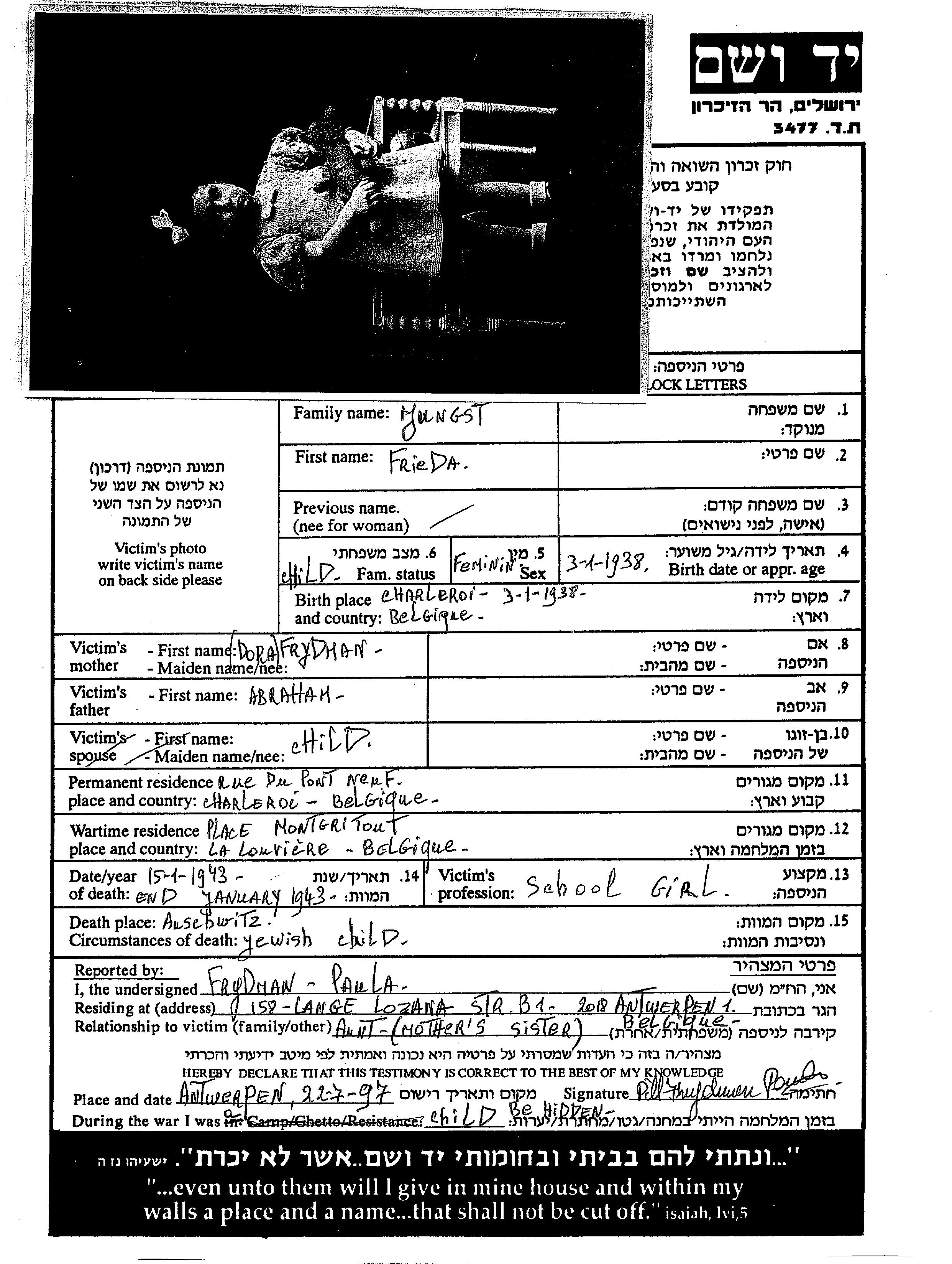 Jungst Frieda 1938 Charleroi, Belgique Feuille de témoignage