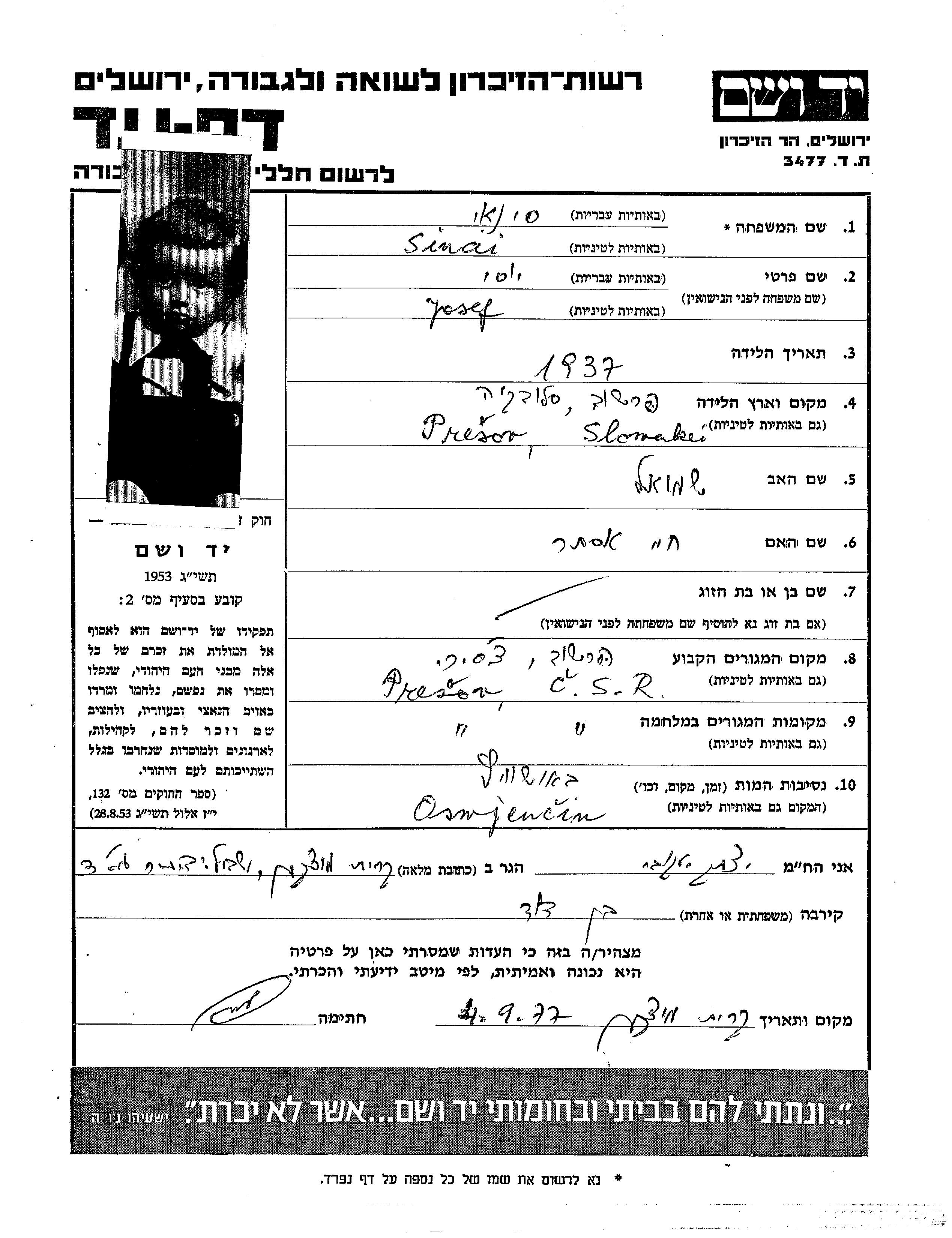 Josef Sinai est né à Presov, Tchécoslovaquie en 1937. Avant la seconde guerre mondiale il vivait à Presov, Tchécoslovaquie.