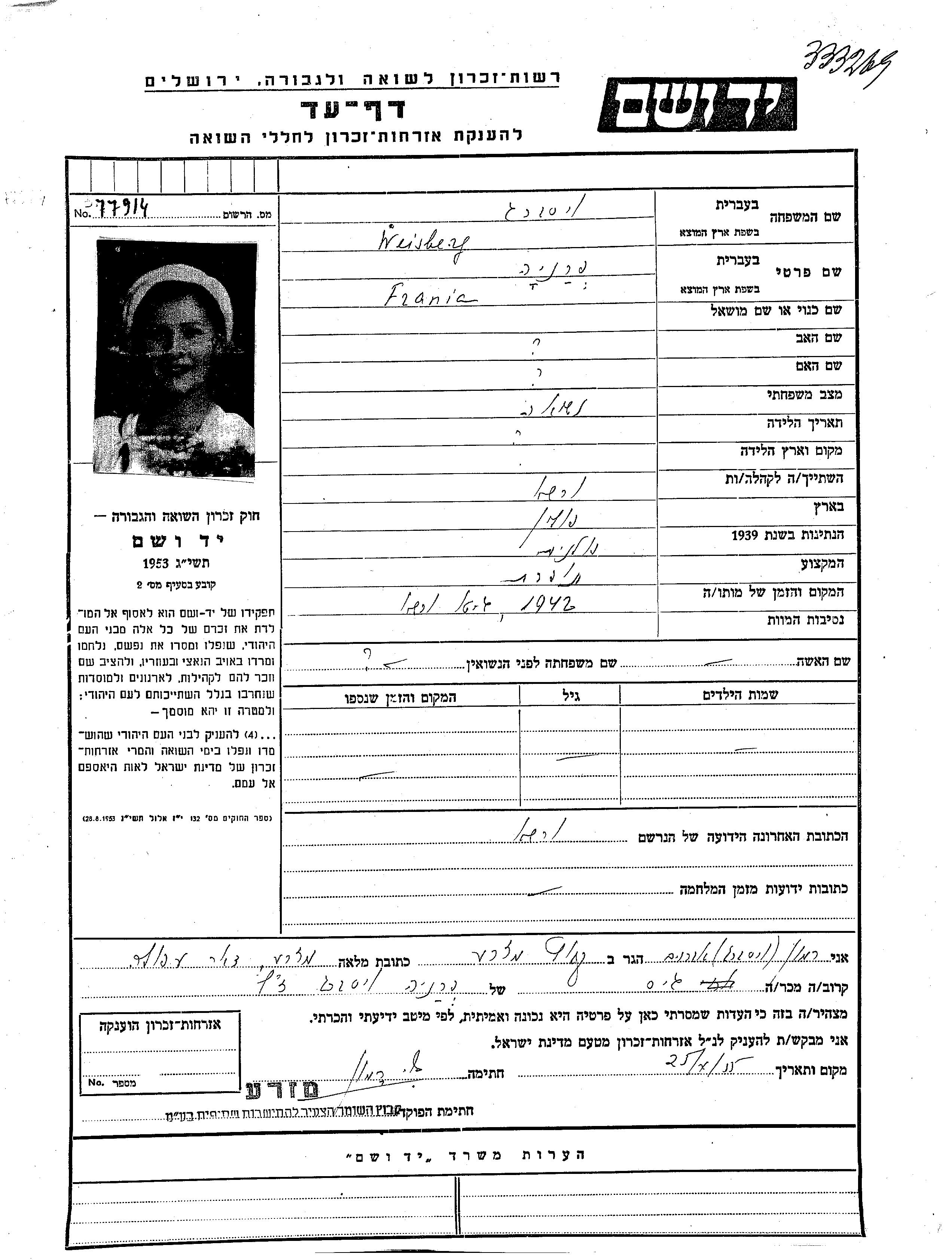 Weisberg Frania Warsaw, Pologne Feuille de témoignage
