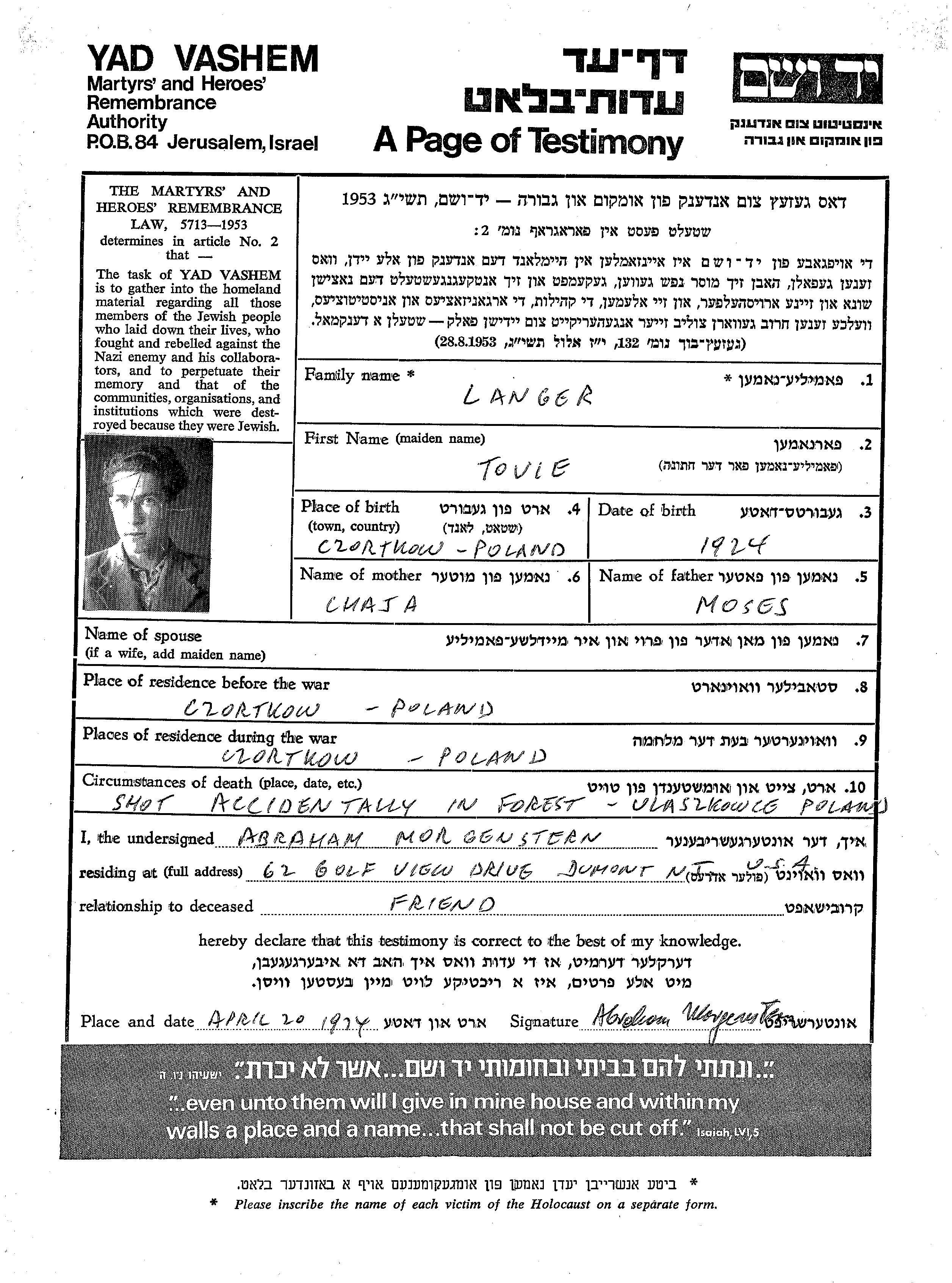 Langer Tovie 1924 Czortkow, Pologne Feuille de témoignage
