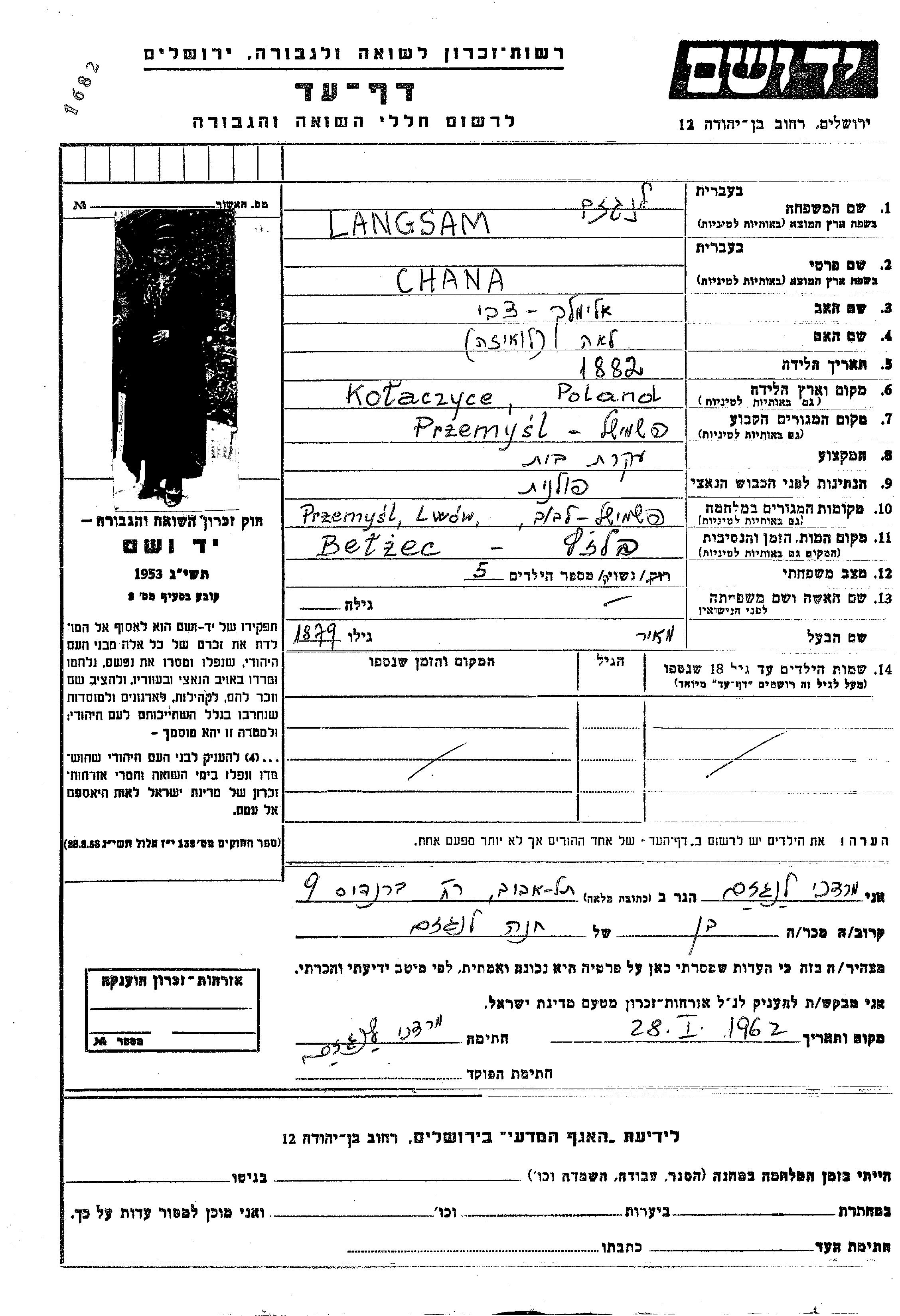 Langsam | Chana | 1882 | Przemysl, Pologne | Feuille de témoignage |