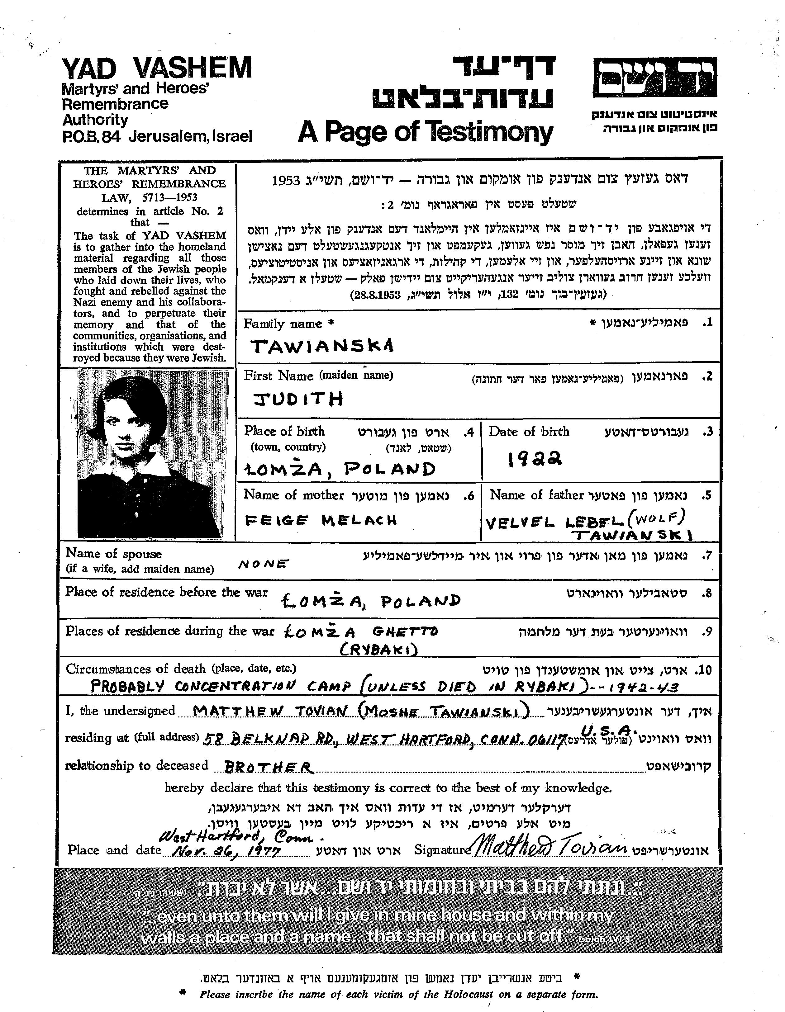 Tawianski | Judith | 1922 | Łomża, Pologne | Feuille de témoignage |