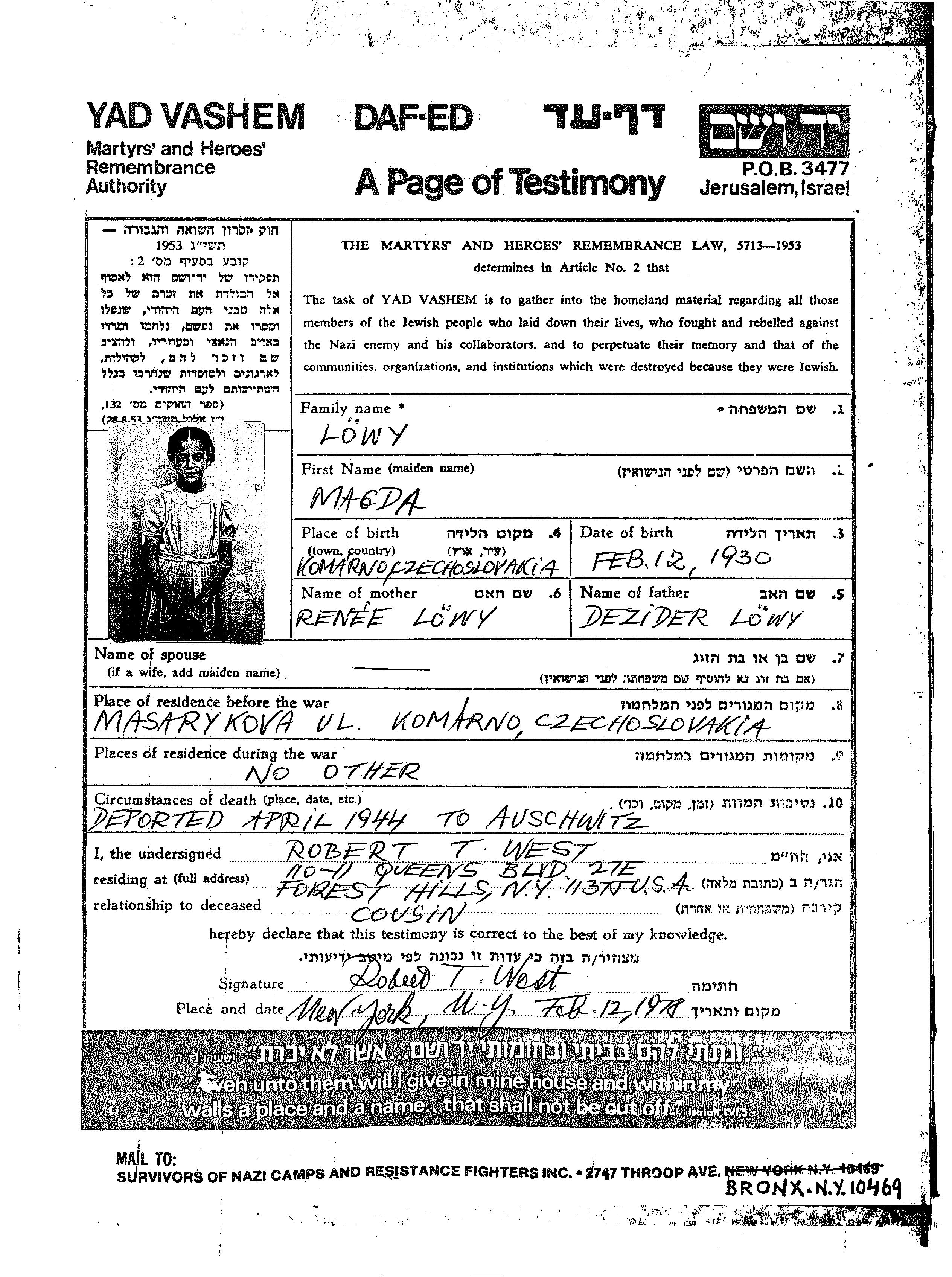 Lowy Magda 1930 Komarno, Tchécoslovaquie Feuille de témoignage