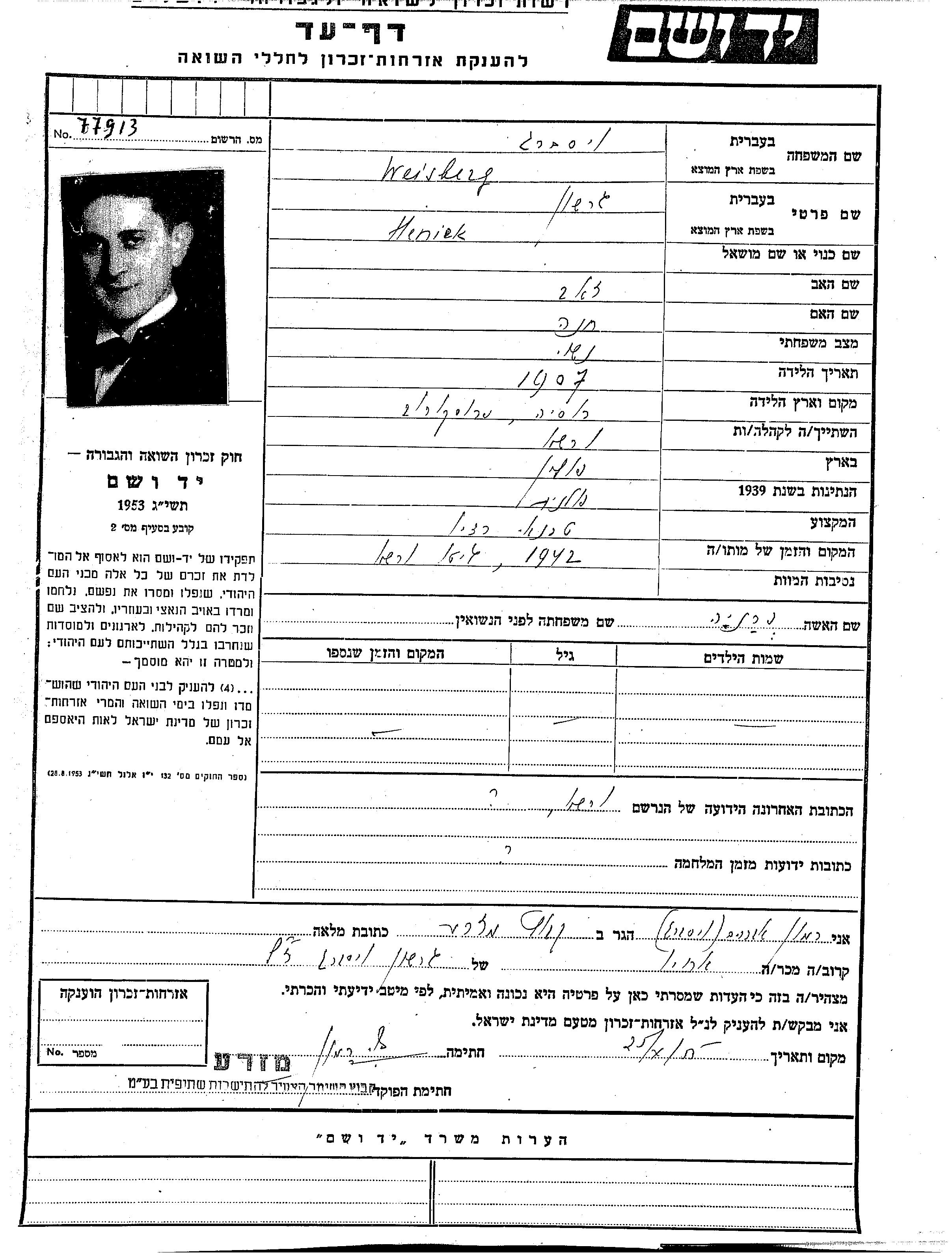 Weisberg Heniek Gershon 1907 Warsaw, Pologne Feuille de témoignage