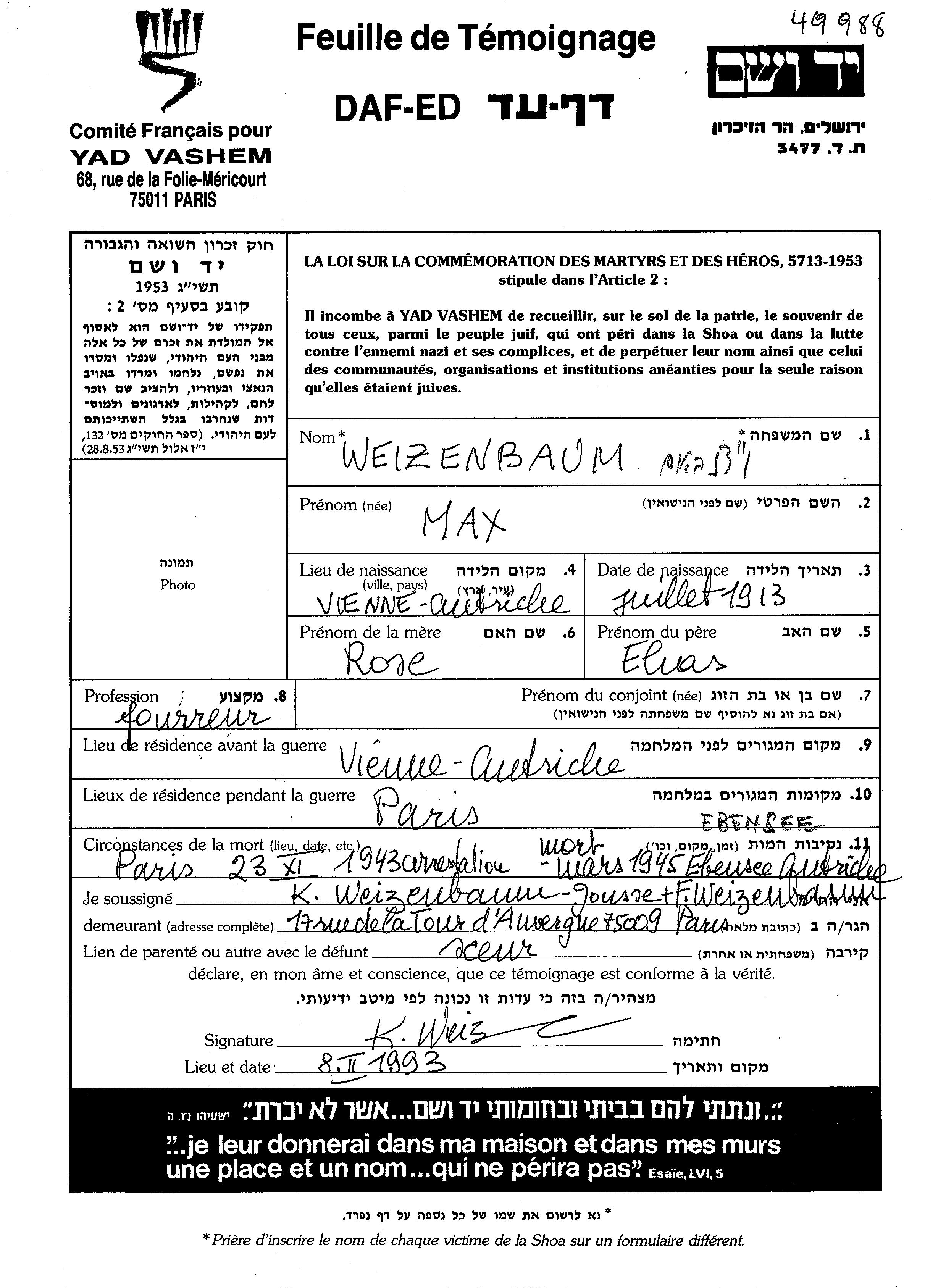 Weizenbaum Max 1913 Wien, Autriche Feuille de témoignage
