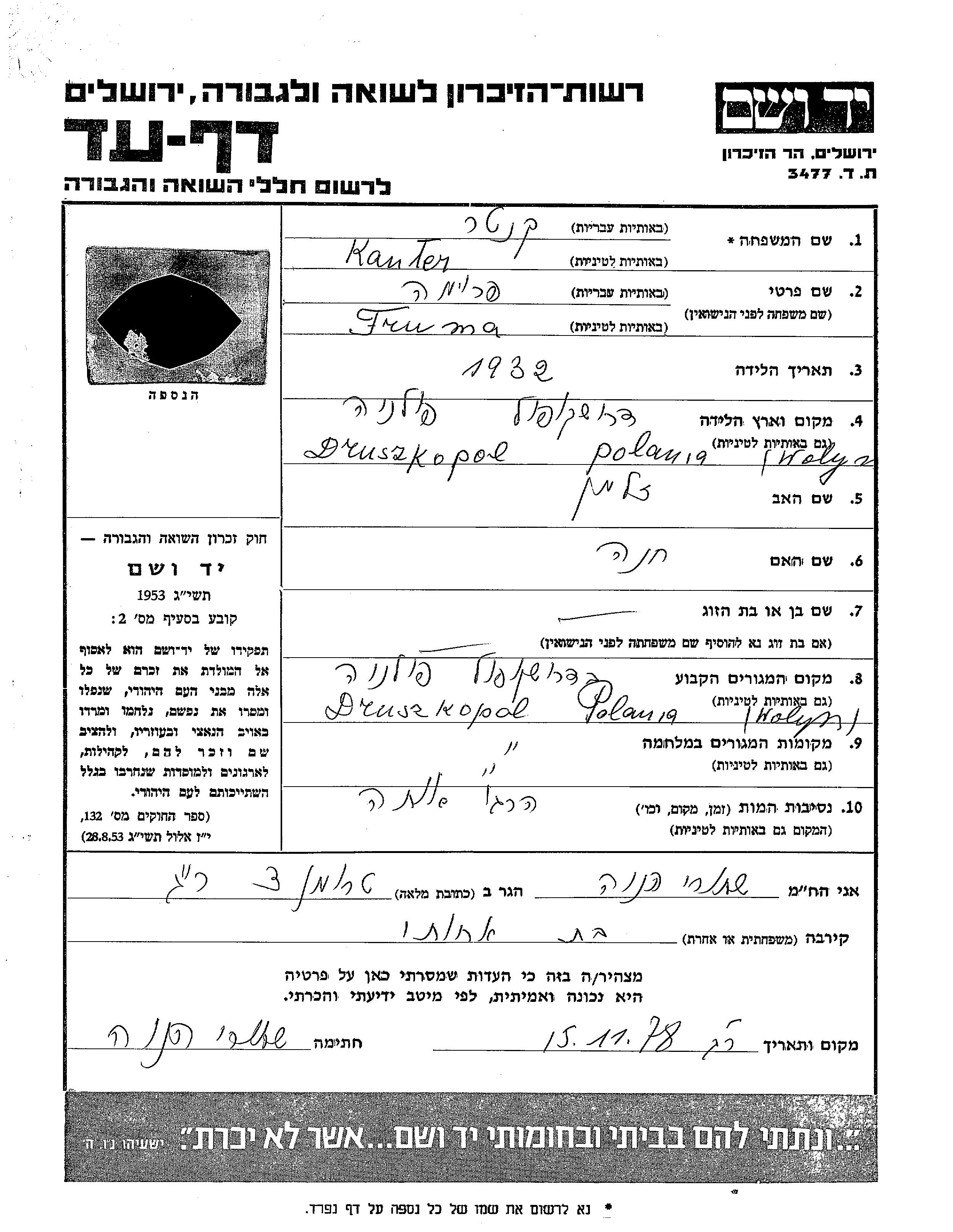 Kanter | Fruma | 1932 | Druszkopol, Pologne | Feuille de témoignage |