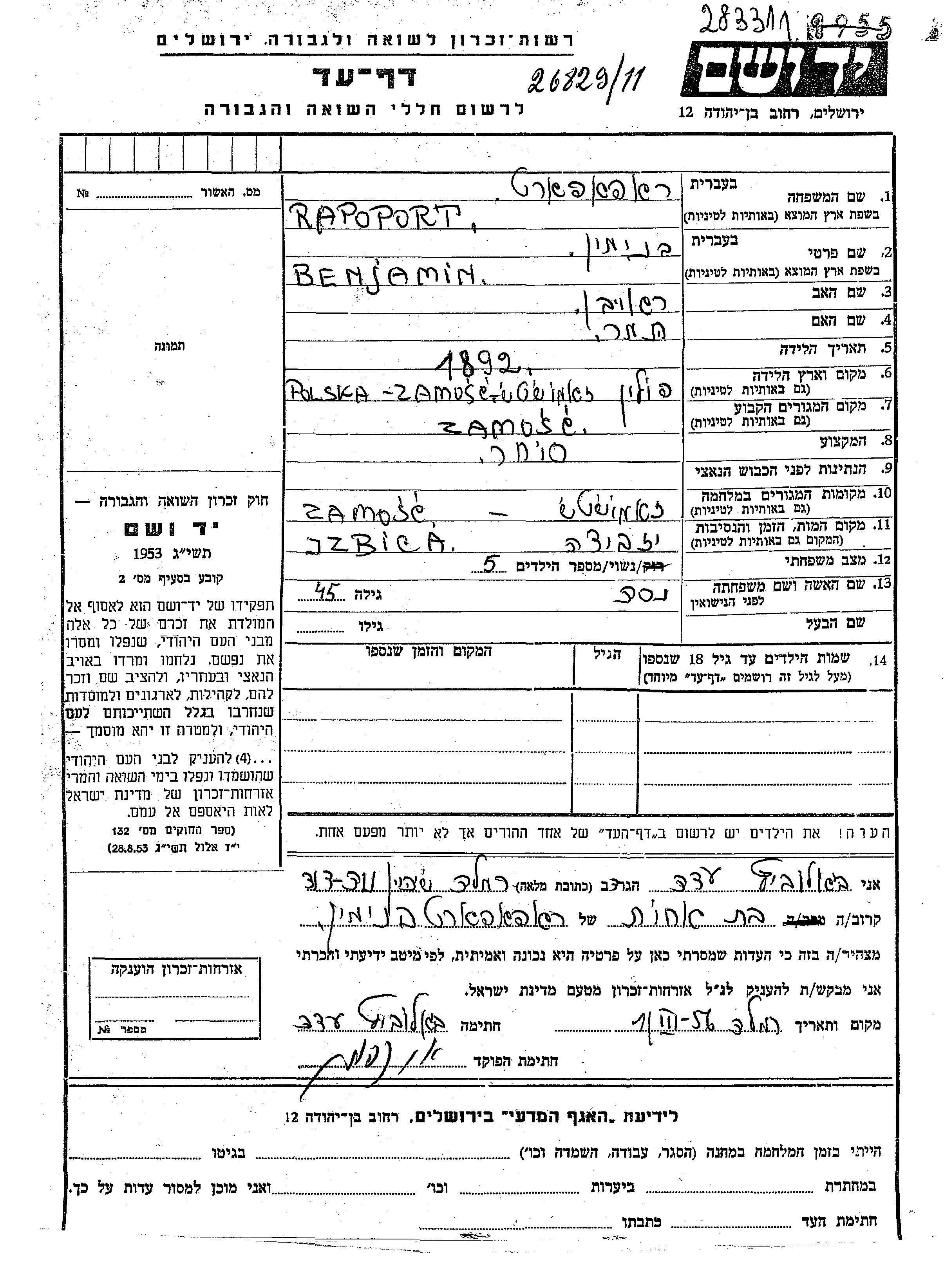 Rapoport Beniamin Zamosc, Pologne Feuille de témoignage