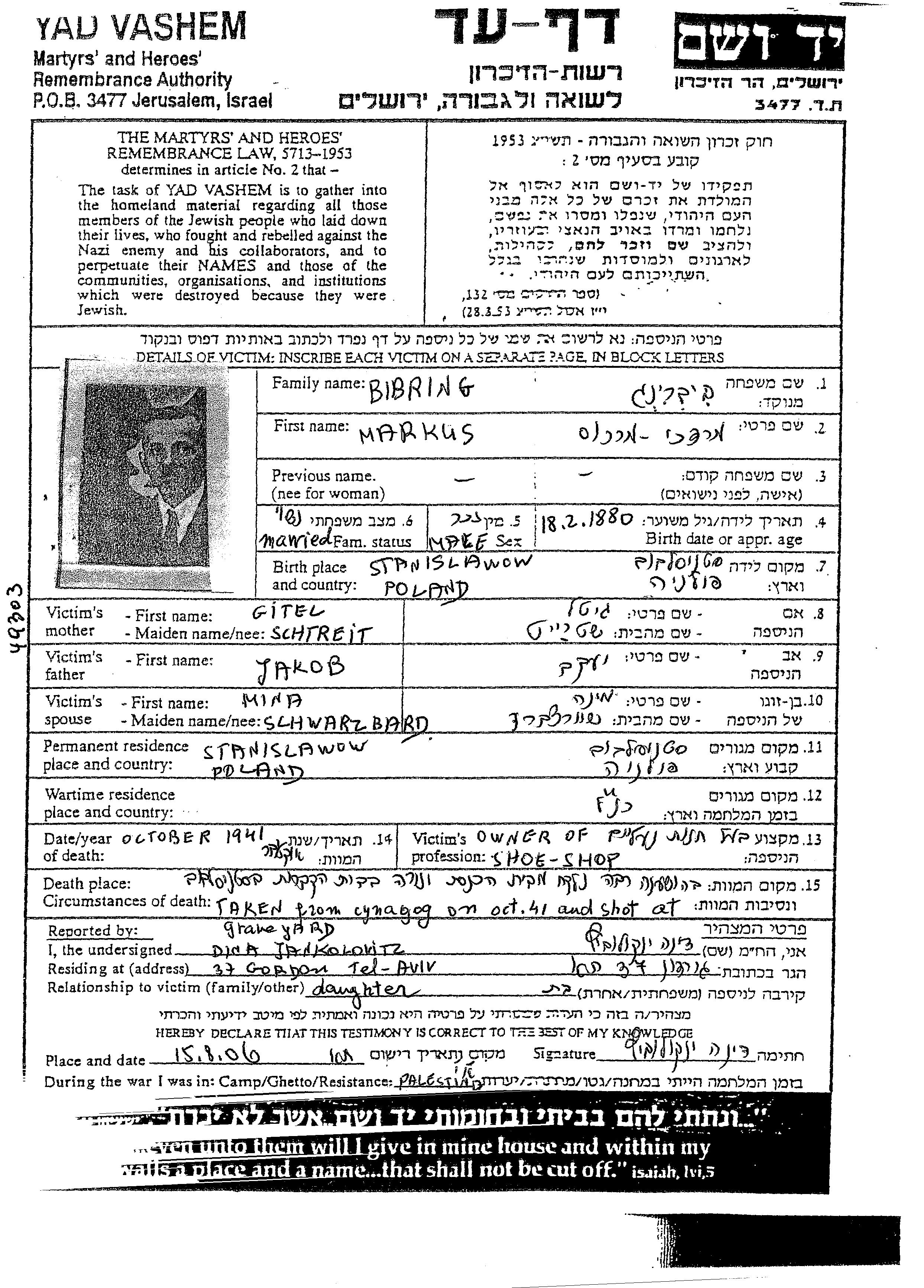 Mordekhai Markus Bibring est né à Stanislawow, Pologne en 1880. Il était Propriétaire d'un magasin de chaussures. Avant la seconde guerre mondiale il vivait à Stanislawow, Pologne.