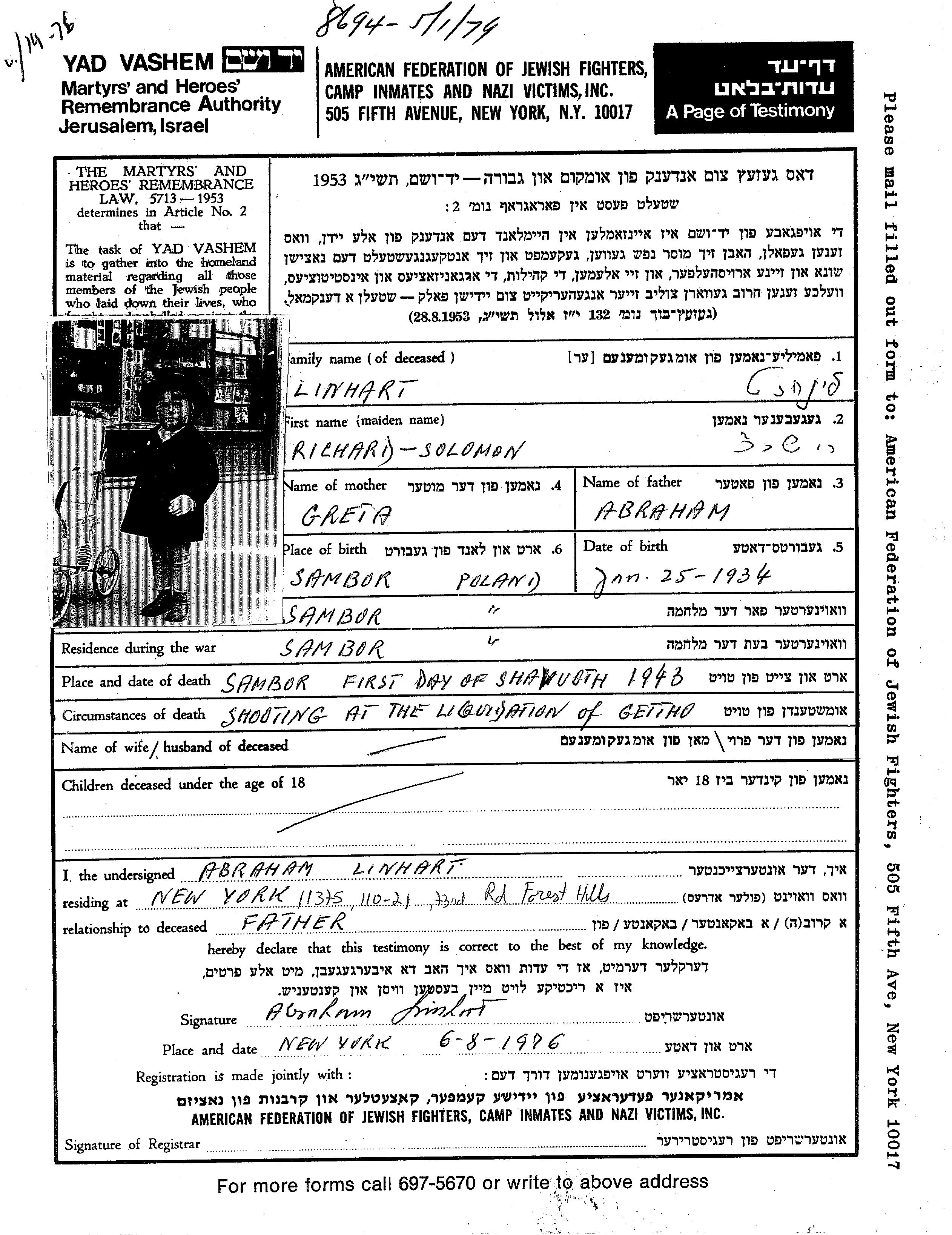 Linhart Richard Solomon 1934 Sambor, Pologne Feuille de témoignage