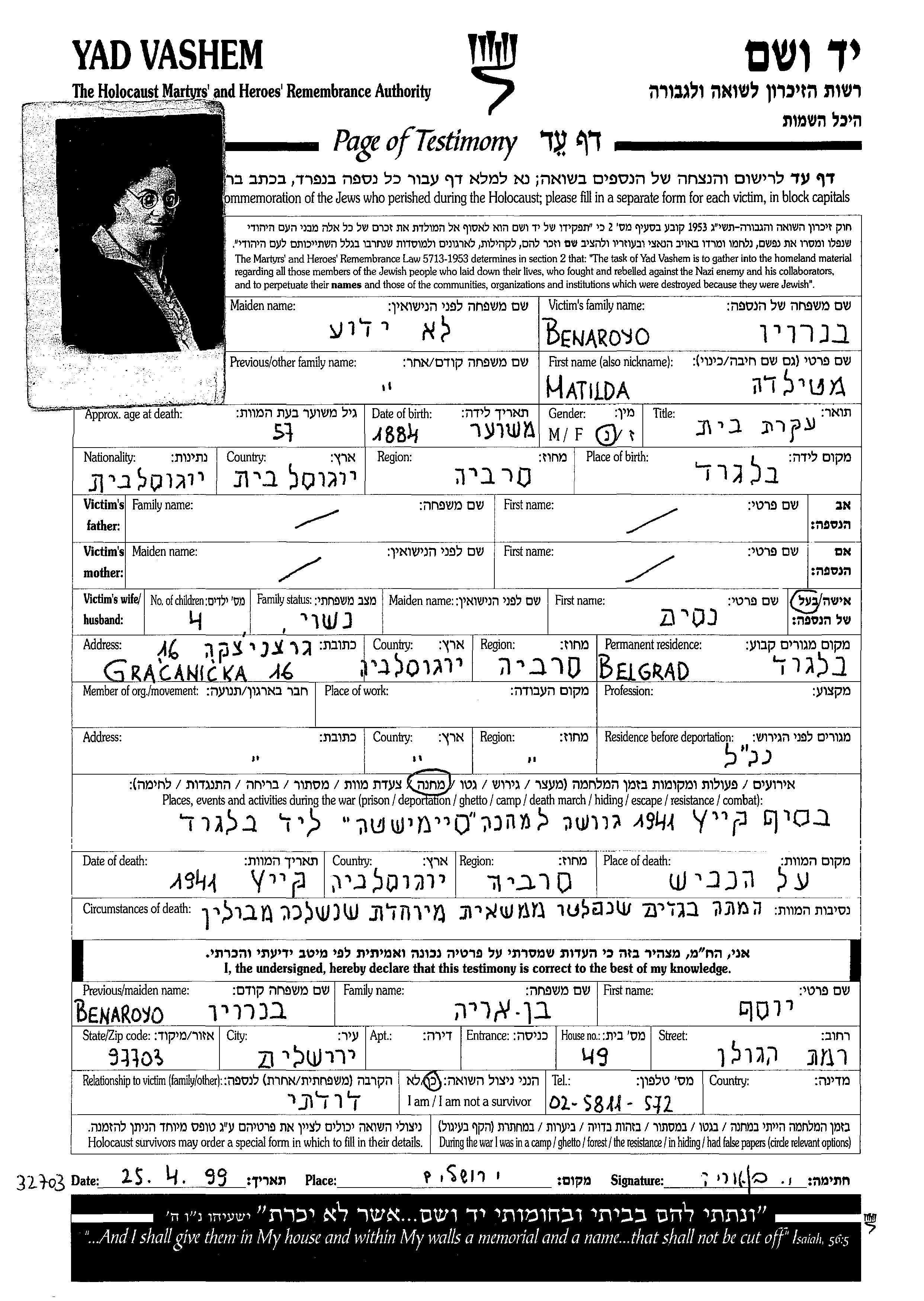 Benaroio | Matilda | 1884 | Belgrad, Yugoslavie | Feuille de témoignage |