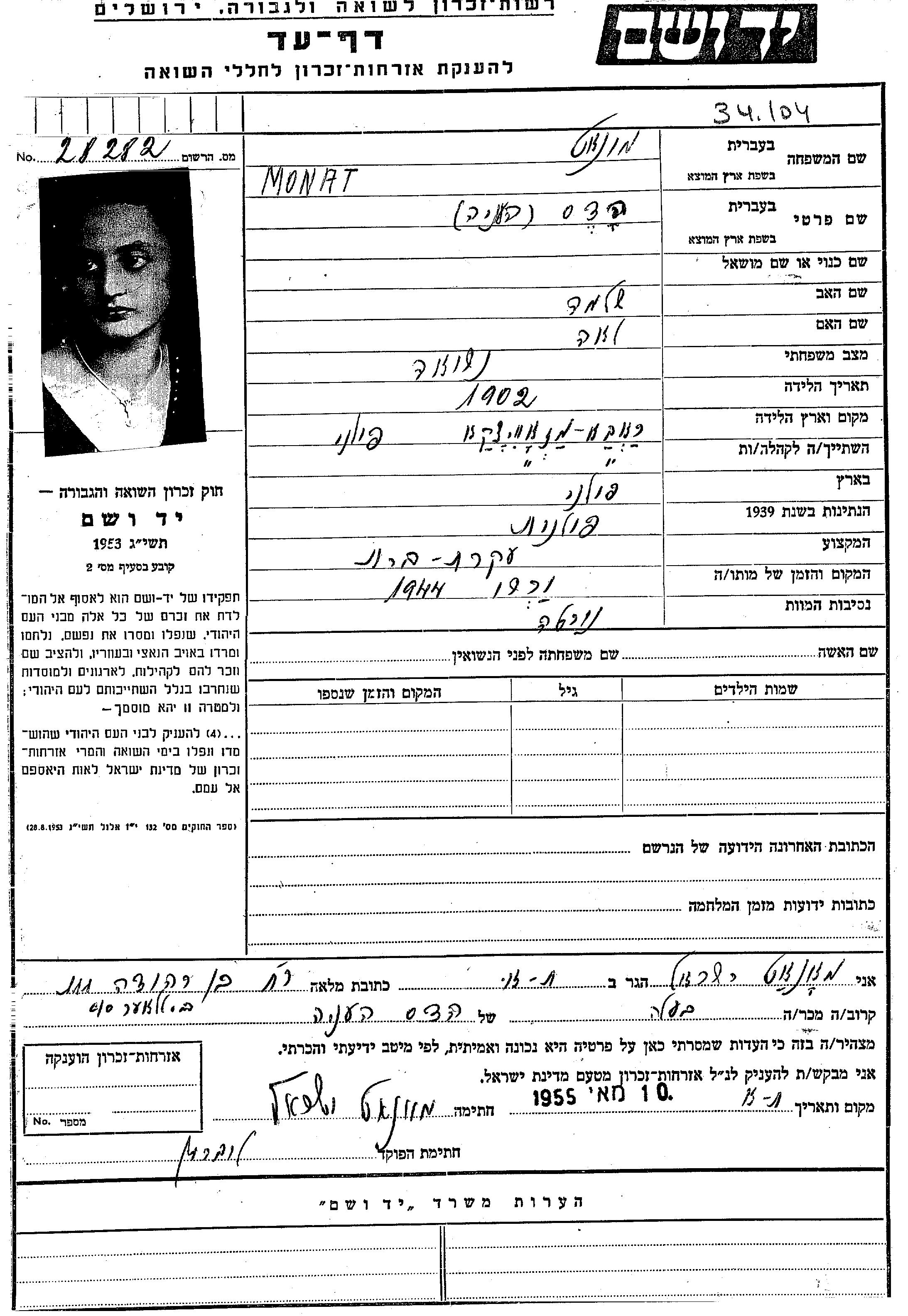 Monat | Hadas Henia | 1902 | Rawa, Pologne | Feuille de témoignage |