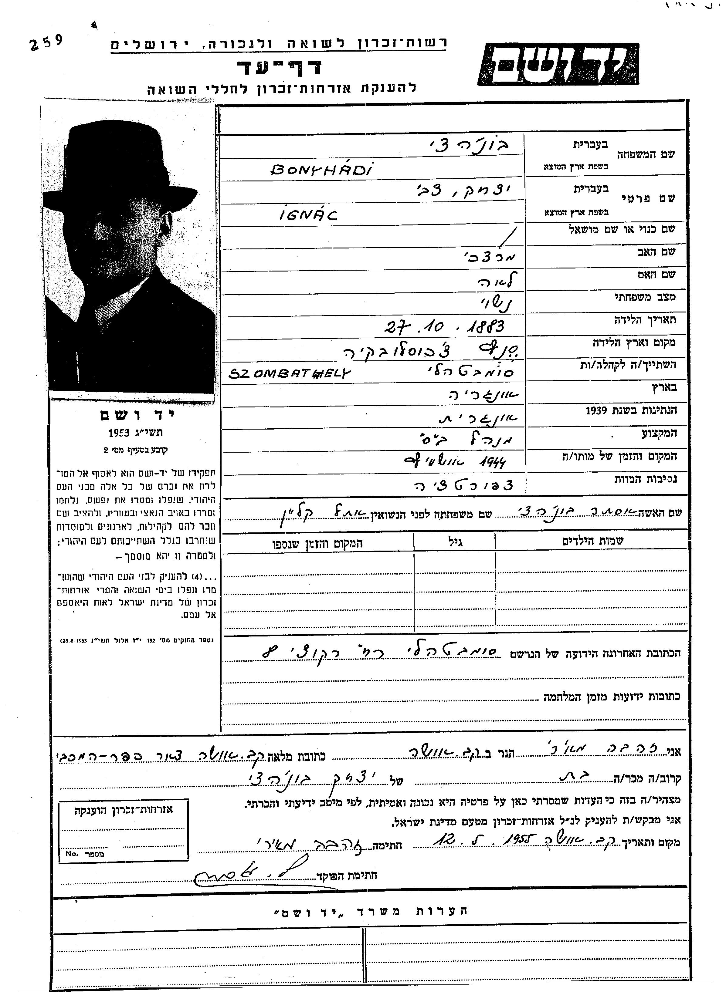Bonyhadi | Ignac Yitzkhak Tzvi | 1883 | Szombathely, Hongrie | Feuille de témoignage |