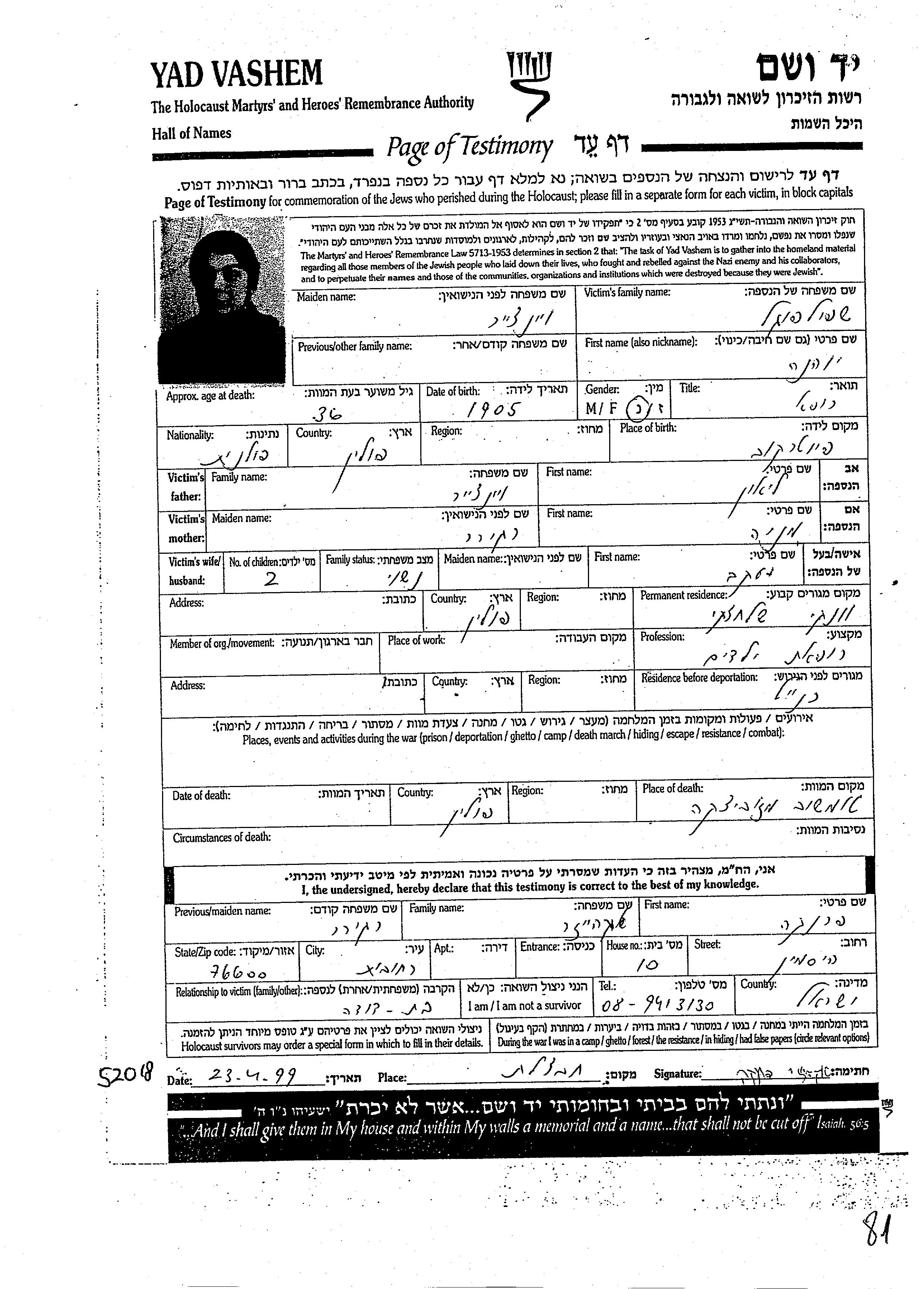 Yad Vashem - Pages of Testimony Names Memorial Collection
