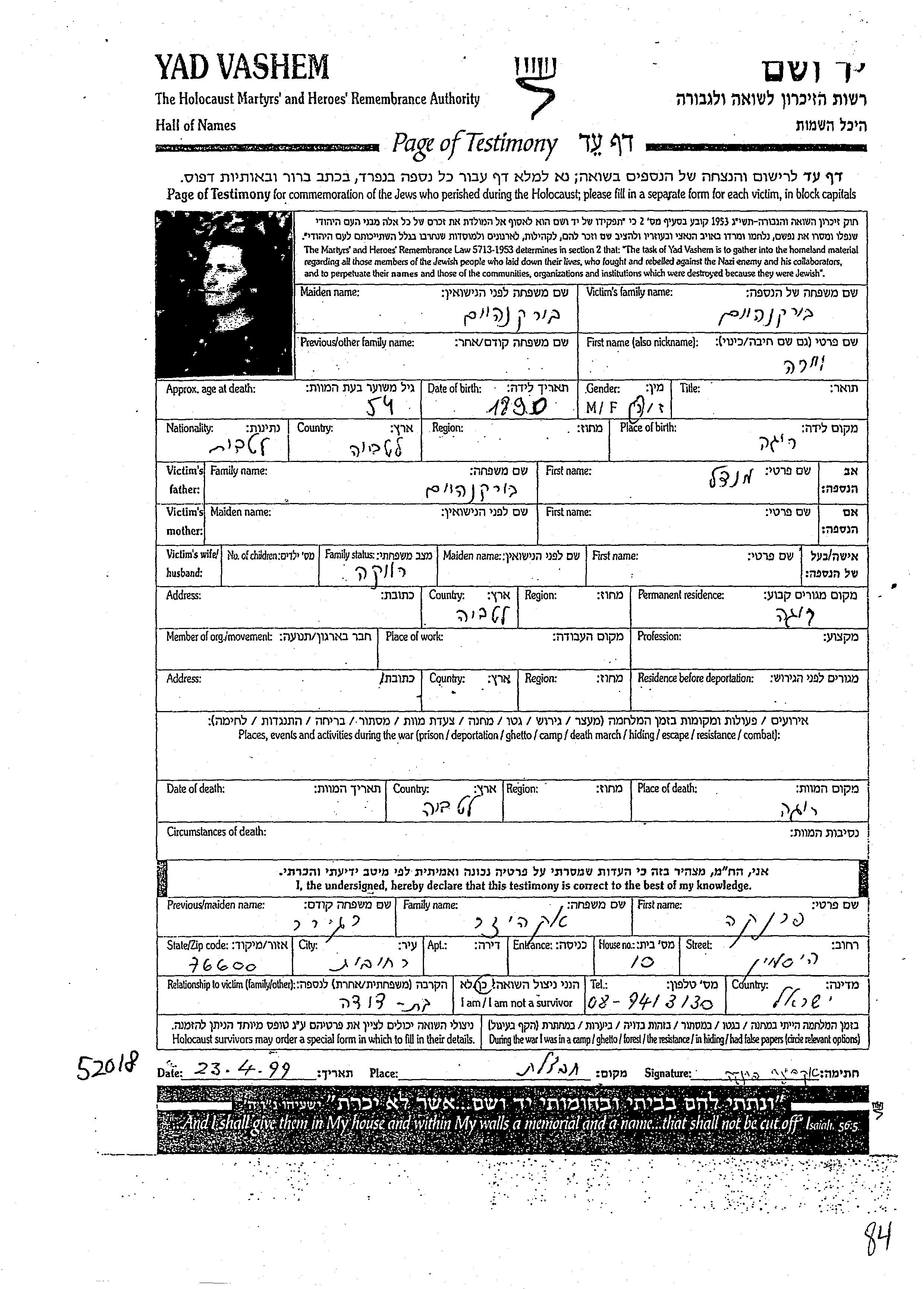 Yad Vashem - Pages of Testimony Names Memorial Collection