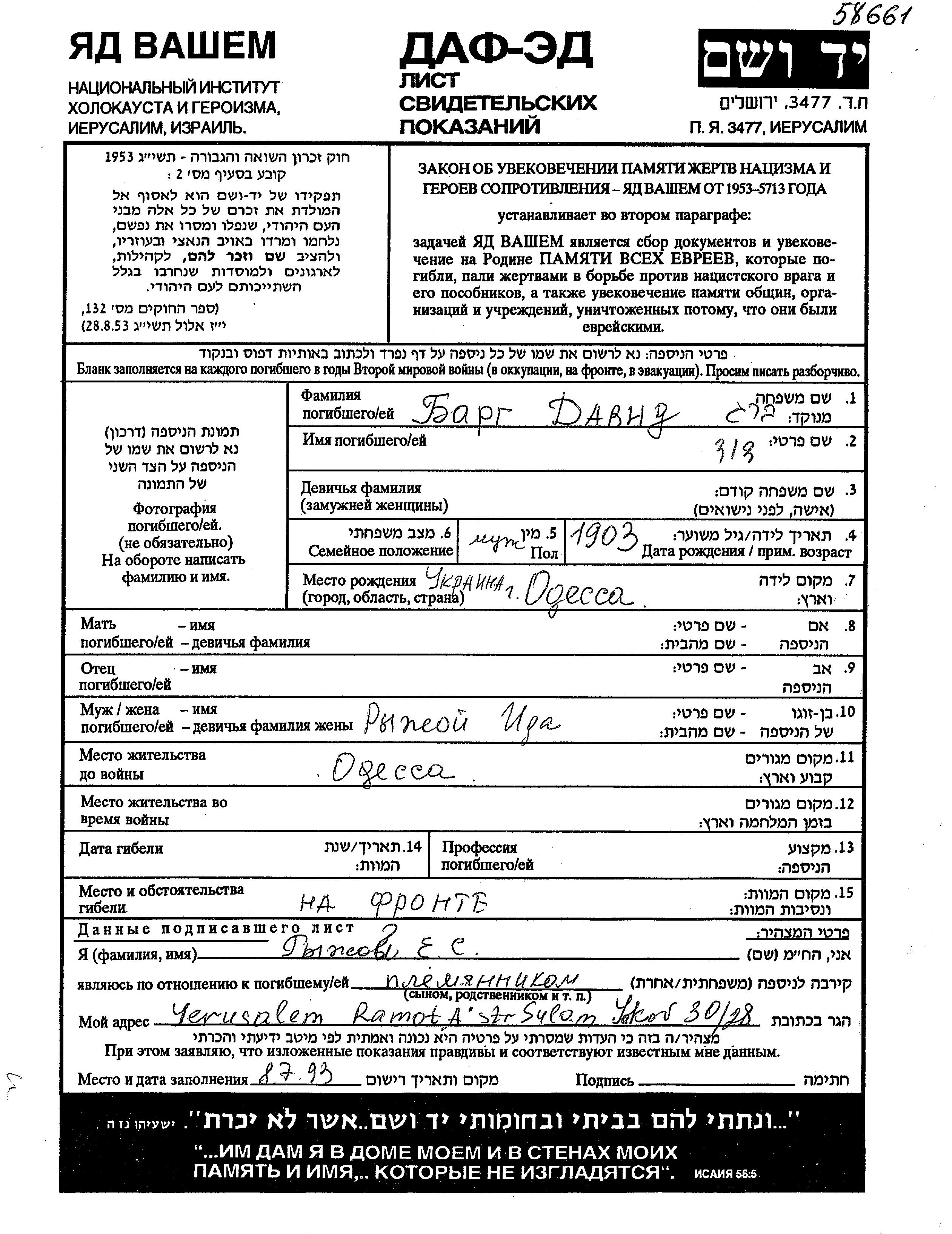 Berg David 1903 Odessa, Ukraine (URSS) Feuille de témoignage